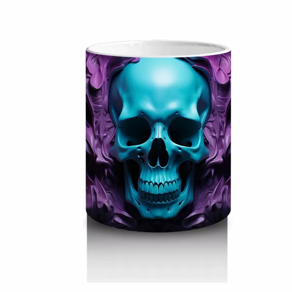 Sisler Arasında Işıltılı Mavi Kafatası – Hediyelik Kahve Kupası Yoğun sislerin içinden parlayan mavi kafatası figürü, bu Cadılar Bayramı baskılı kupaya büyülü bir atmosfer kazandırıyor. Gotik ama modern bir hediyelik kahve kupası alternatifi.