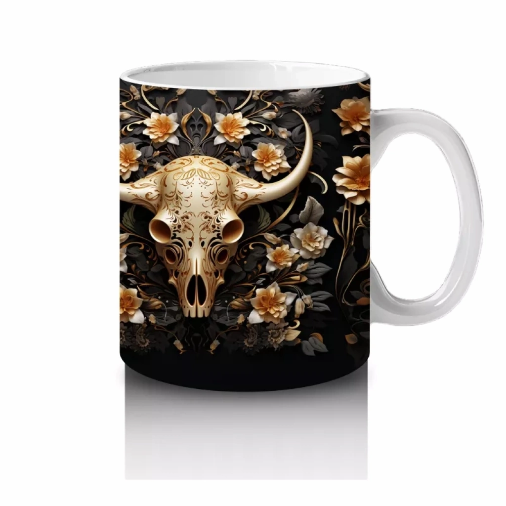 Siyah arka plan üzerinde altın mandala motifli boğa figürü, şıklık ve gücü simgeliyor. Zarif ve etkileyici tasarımlar arayanlar için özel bir kupa.