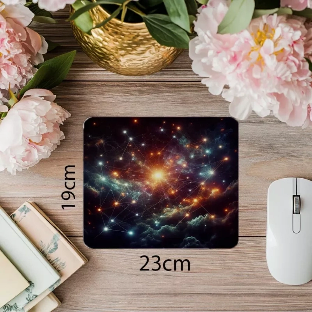 Siyah fon üzerinde parlayan yıldız desenleriyle hazırlanan bu mousepad, sade ama etkileyici bir uzay teması arayanlar için ideal seçimdir.