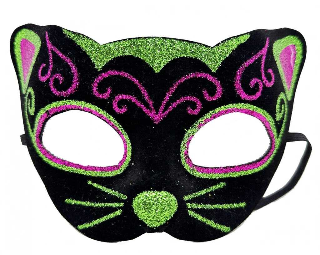 Siyah Kadife Kaplama Üzeri Pembe Yeşil Sim İşlemeli Kedi Maskesi, balolar, maskeli partiler veya kostüm partileri gibi eğlenceli etkinliklerde sevimli ve dikkat çekici bir kedi görünümü elde etmek isteyenler için mükemmel bir seçimdir. Yumuşak siyah kadife kaplaması, parlak sarı yeşil sim işlemesi ve sevimli kedi kulakları ile bu maske sizi partinin en eğlenceli ve sevimli konuğu yapacak.