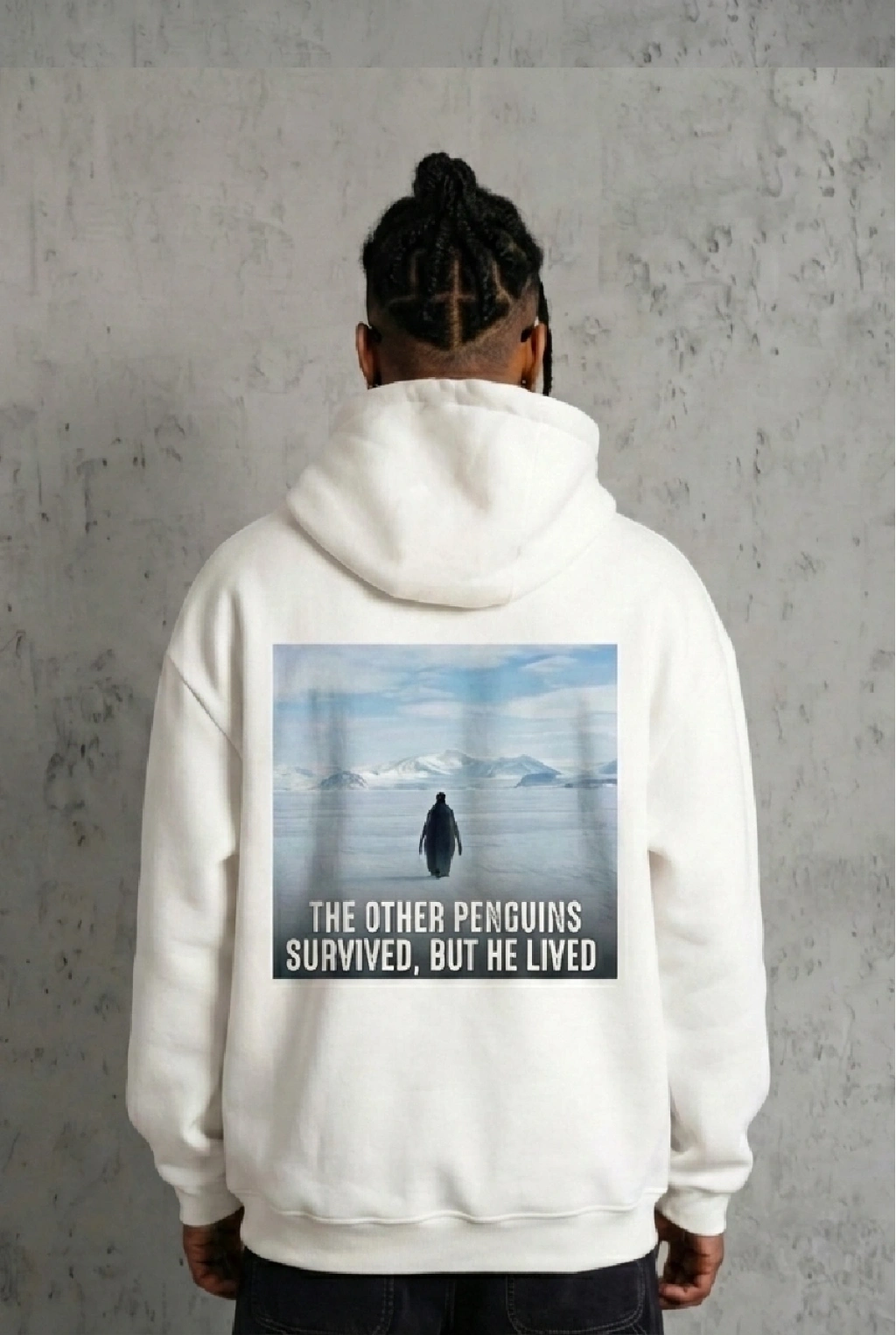 Siyah Oversize Hoodie - Sırt Baskılı "Survivor Penguin" Temalı, Felsefi Yazılı Kapüşonlu Sweatshirt - Beyaz