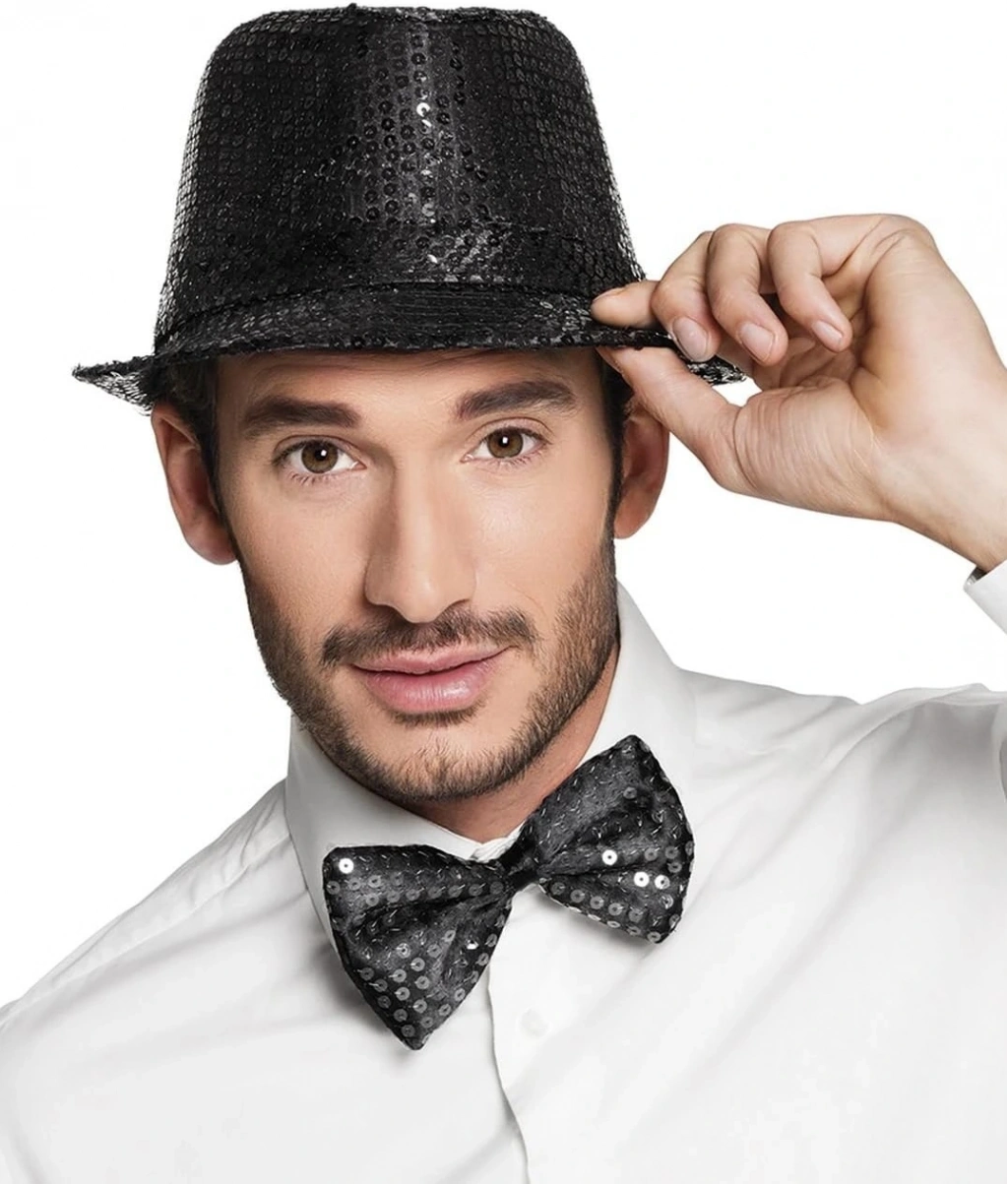 Siyah Payetli Şapka Ve Papyon Seti – Parıltılı Yetişkin Kostüm Seti