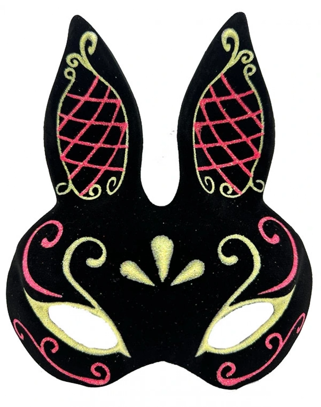 Gizemli ve göz alıcı bir görünüm için siyah süet ve kırmızı gold simli tavşan maskemiz tam size göre!