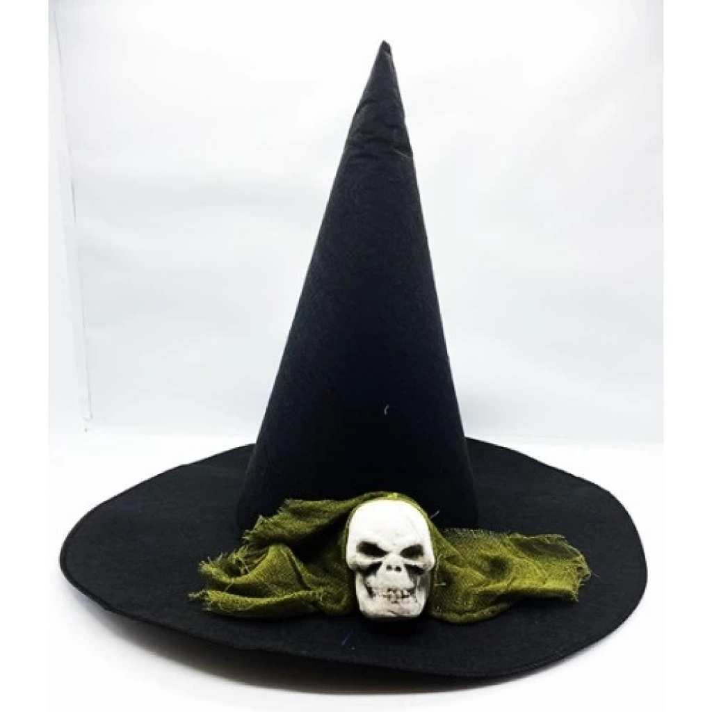 Siyah Renk Yeşil Duvaklı Kuru Kafa Temalı Cadı Şapkası 35x38 cm