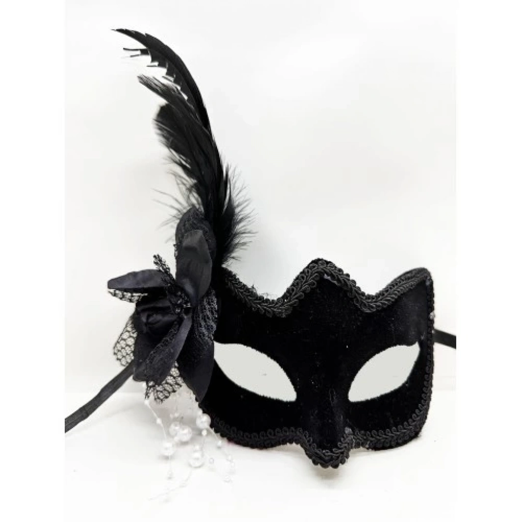 Siyah Süet Yandan Tüylü İncili Parti Maskesi