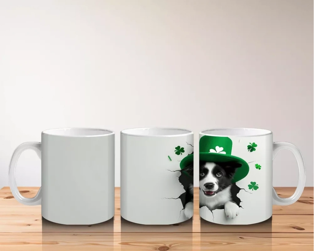 St. Patrick gününe özel yeşil şapkasıyla bu siyah beyaz yavru köpek, kutlama ruhunu tatlı bir ifadeyle yansıtıyor. Tematik ve eğlenceli bir kupa arayanlar için ideal bir hediye alternatifi.