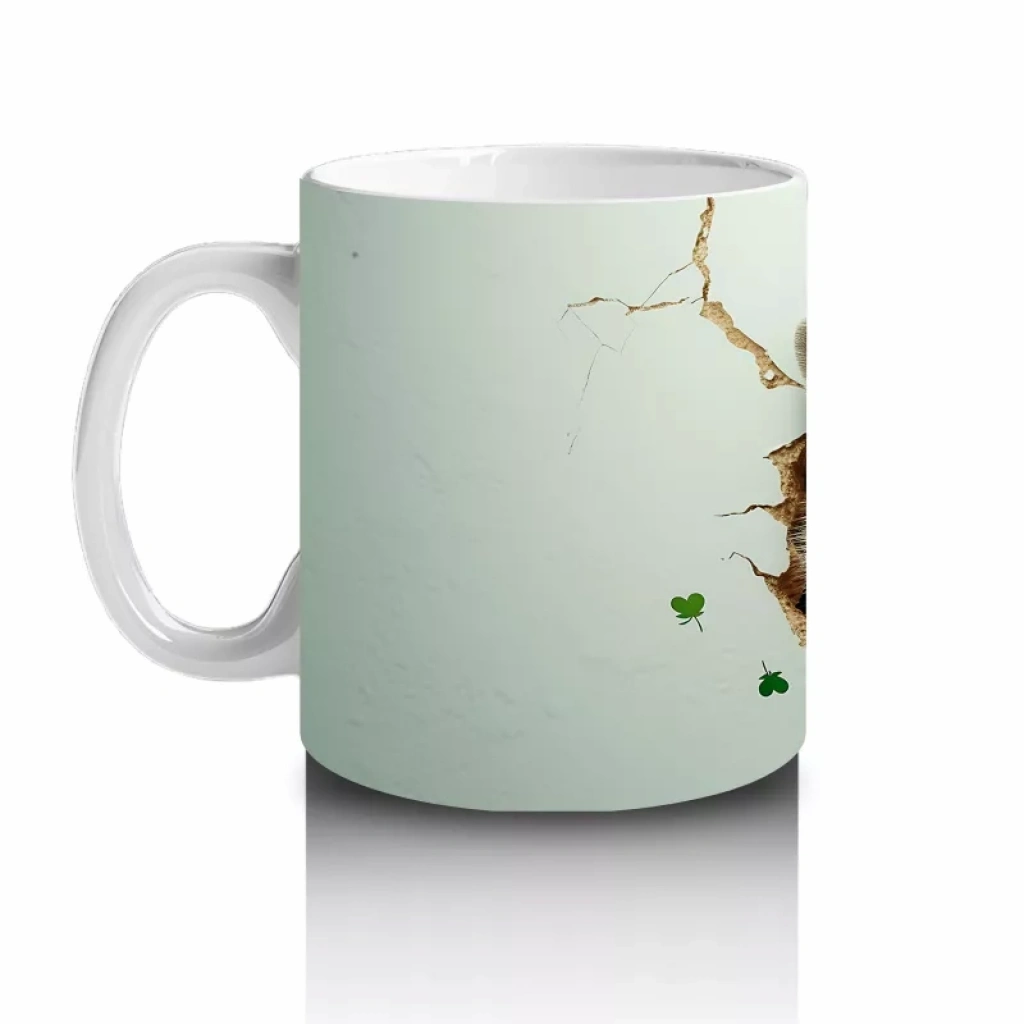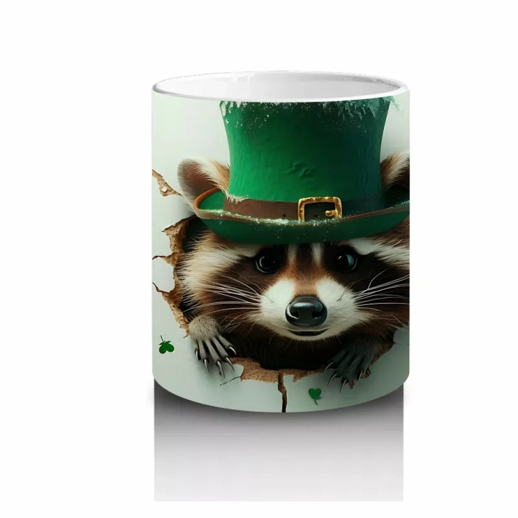St. Patrick şapkası takan tüylü rakun figürü, neşeli ve sevimli bir atmosfer yaratıyor. Kutlama ve sıcaklık dolu tasarımlar arayanlar için ideal bir kupa.
