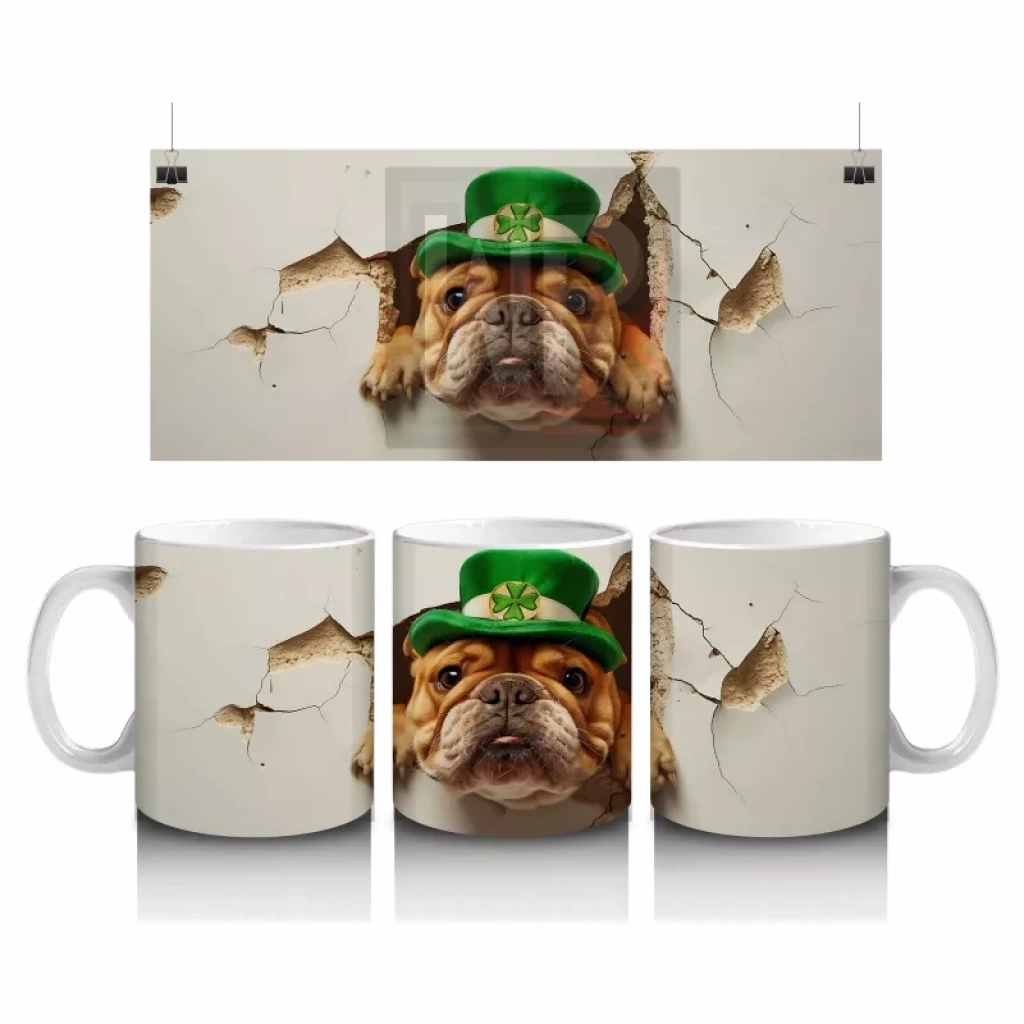 St. Patrick temalı şapka takan bulldog, kutlama ve eğlence havasını sıcak ve neşeli bir şekilde yansıtıyor. Tematik ve sevimli tasarımlar arayanlar için ideal.