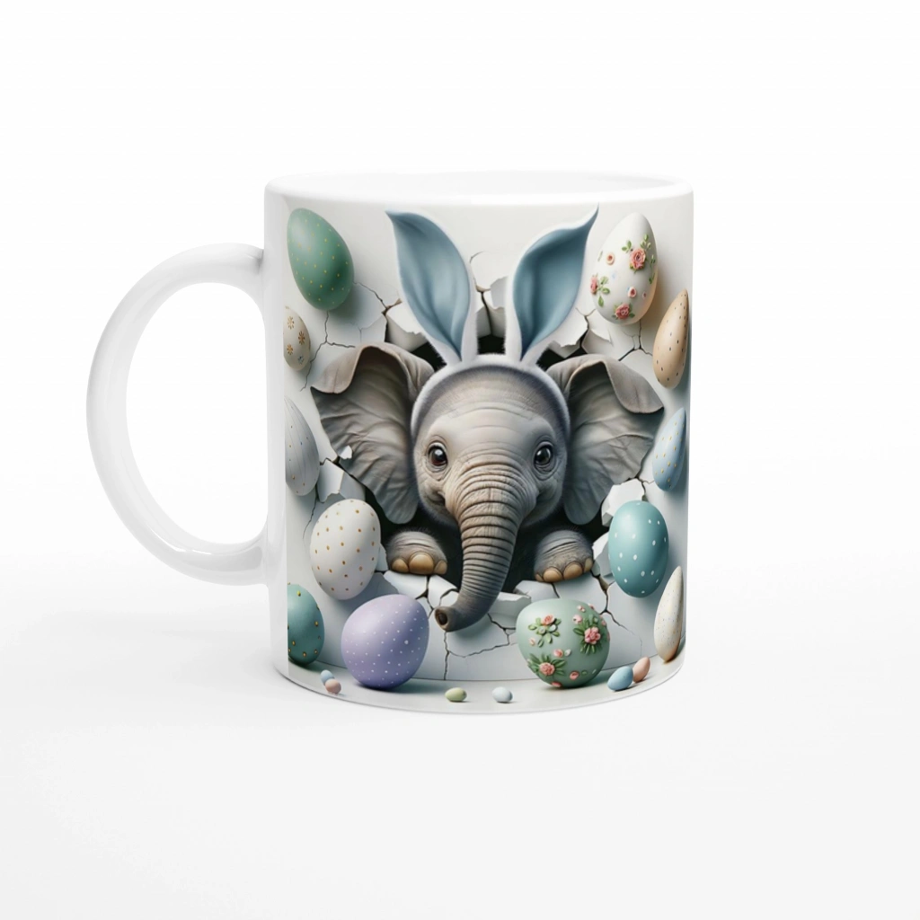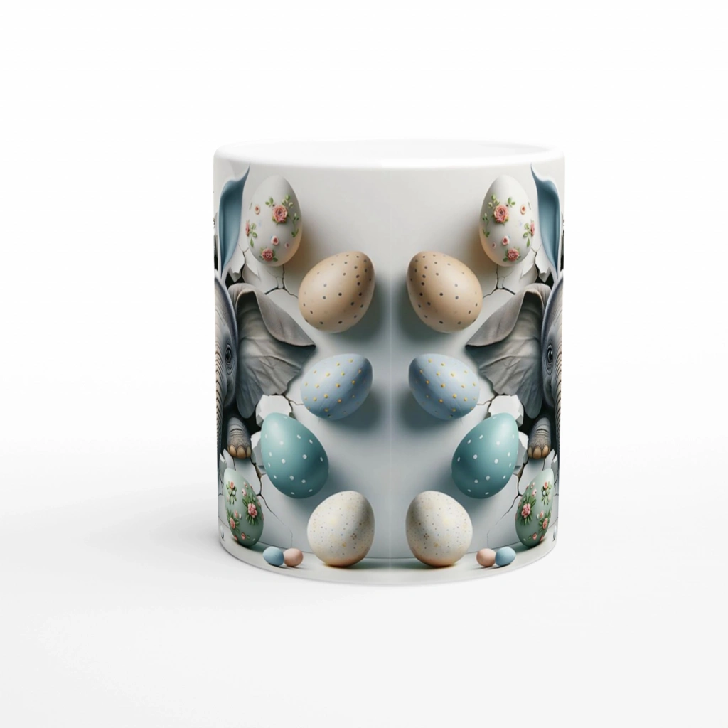 Tavşan Kulaklı Fil ve Paskalya Yumurtaları Temalı Baskılı Kupa Bardak, çatlak duvardan bakan sevimli fil ve pastel tonlardaki yumurtalarla çocuk ruhunu ve bahar enerjisini bir araya getiriyor. Eğlenceli ve şirin bir hediye seçeneğidir.