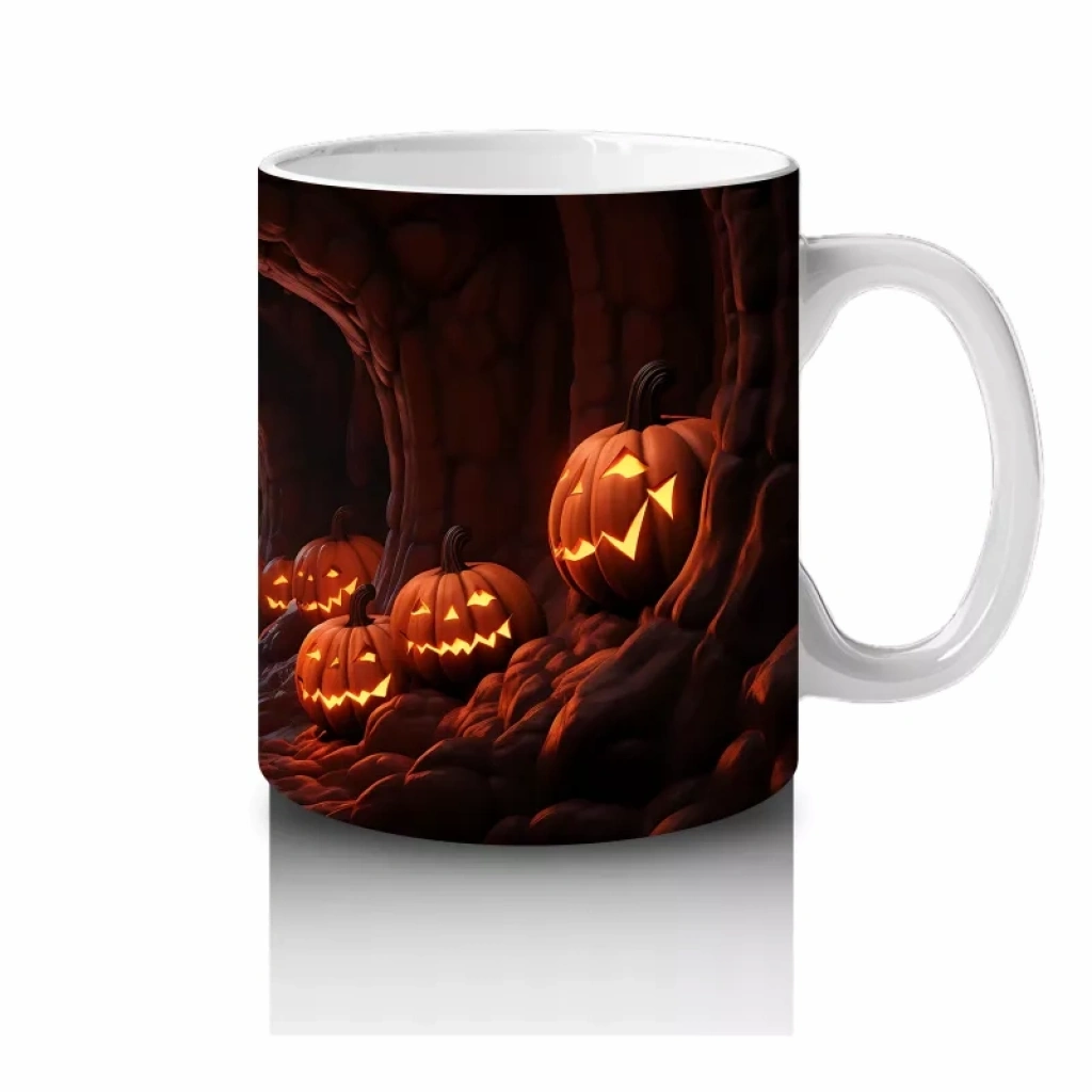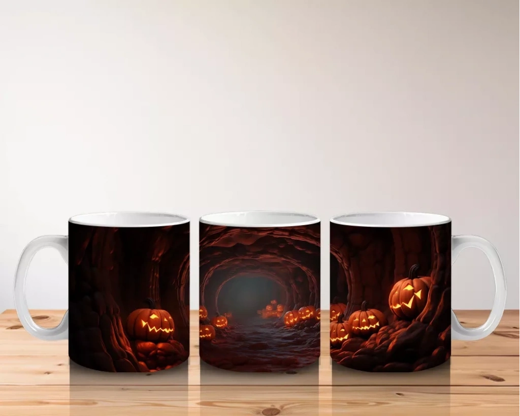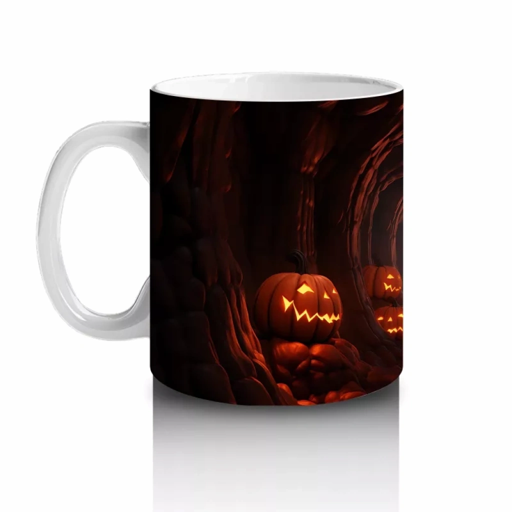 Labirent Gibi Tünelde Gülümseyen Kabaklar – Hediyelik Kahve Kupası Dolambaçlı bir tünelde sevimli bir şekilde gülümseyen balkabakları, bu Cadılar Bayramı baskılı kupayı eğlenceli kılıyor. Mizahi ve tematik bir hediyelik kahve kupası alternatifidir.