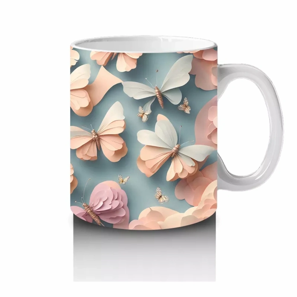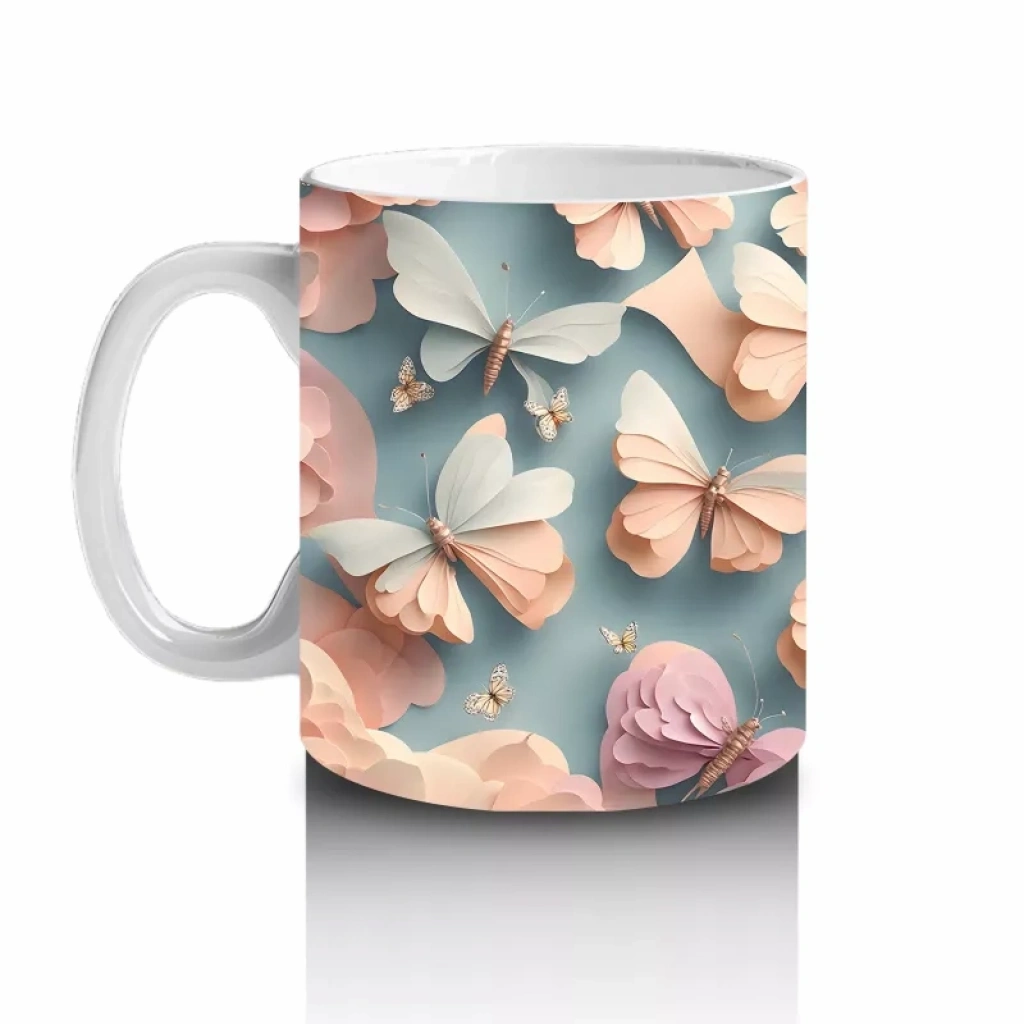 Turkuaz ve Şeftali Tonlarında Rölyef Kelebekler – Baskılı Kahve Kupası