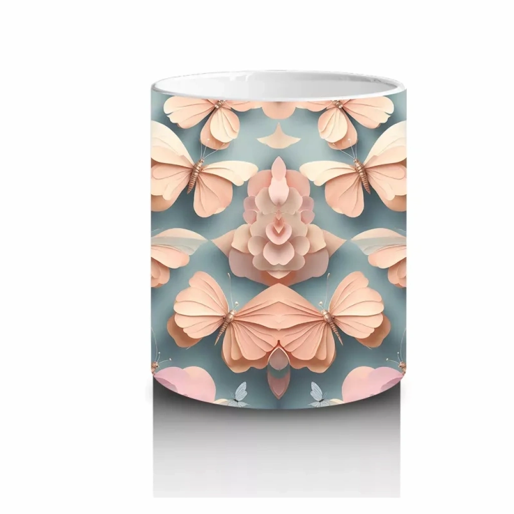 Turkuaz ve şeftali renklerinin uyumuyla öne çıkan kabartmalı kelebekler, zarif ve canlı bir atmosfer yaratıyor. Renkli ve sanatsal detaylardan hoşlananlar için özgün bir kupa seçimi.