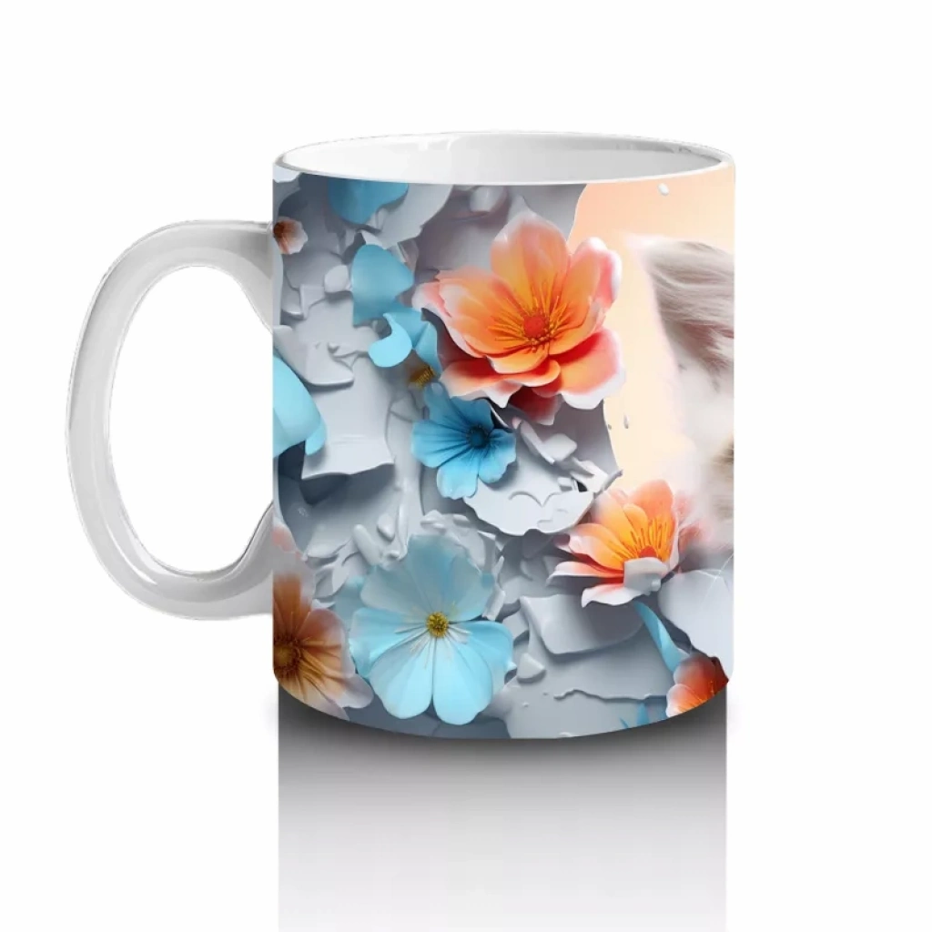 Turuncu çiçeklerin sıcaklığıyla çevrili bu tatlı kedi, iç ısıtan bir görüntü sunuyor. Neşeli ve canlı renkleriyle dikkat çeken bu tasarım, güne keyifle başlamak isteyenler için ideal.