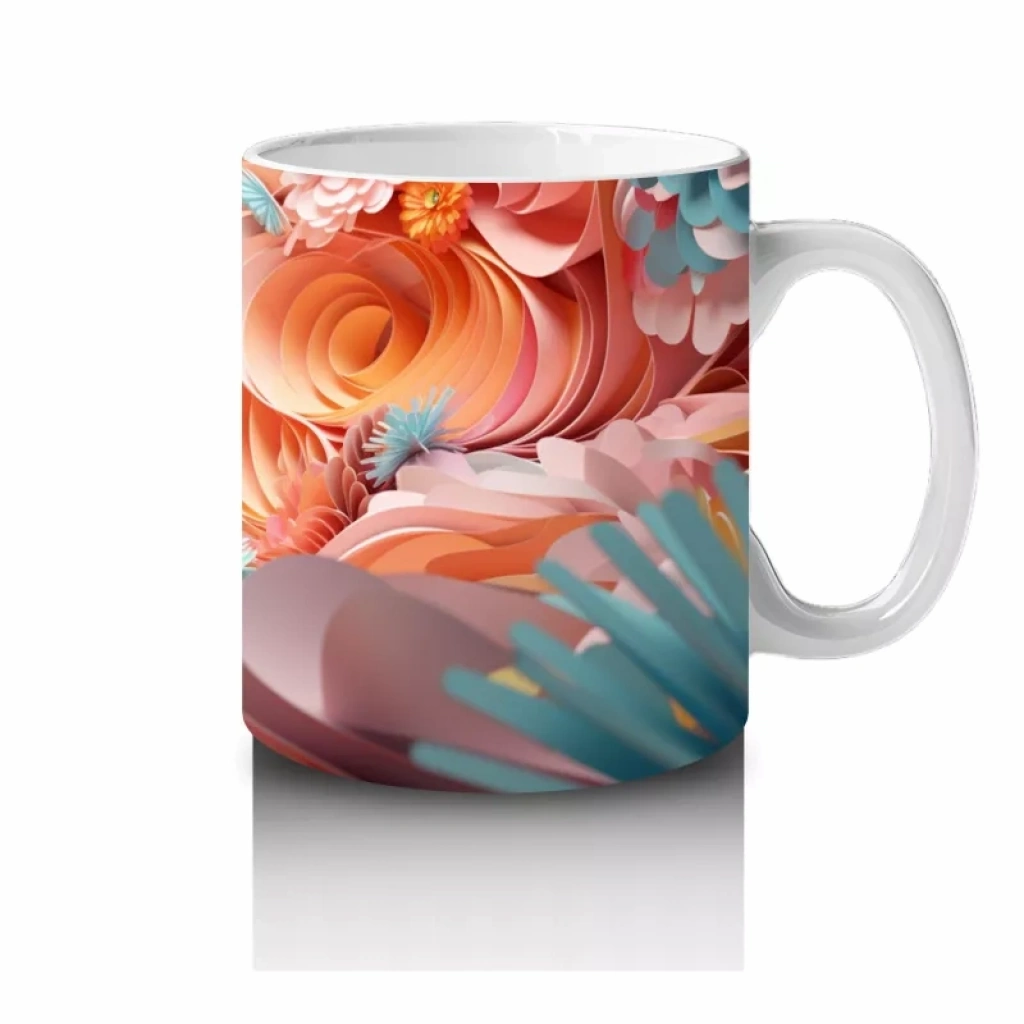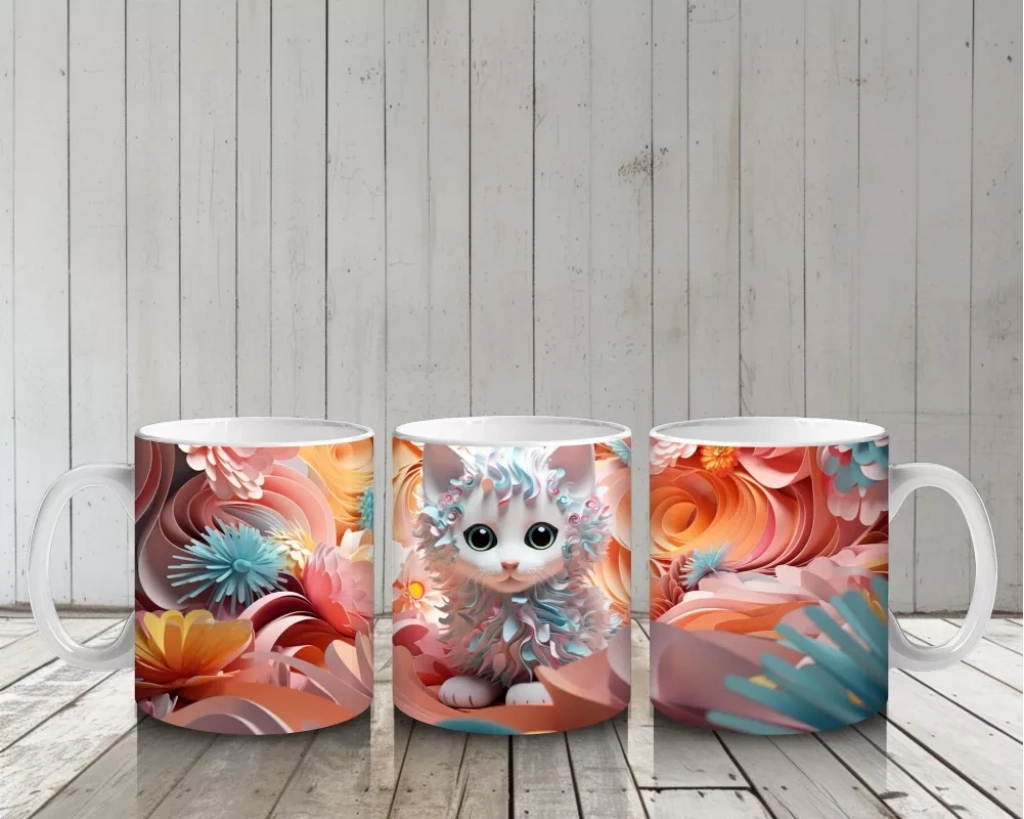 Turuncu çiçeklerle çevrelenmiş, parlak gözlere sahip kedi figürü, canlılık ve enerji dolu bir görünüm sunuyor. Renkli ve pozitif detayları sevenler için göz alıcı bir kupa tasarımı.