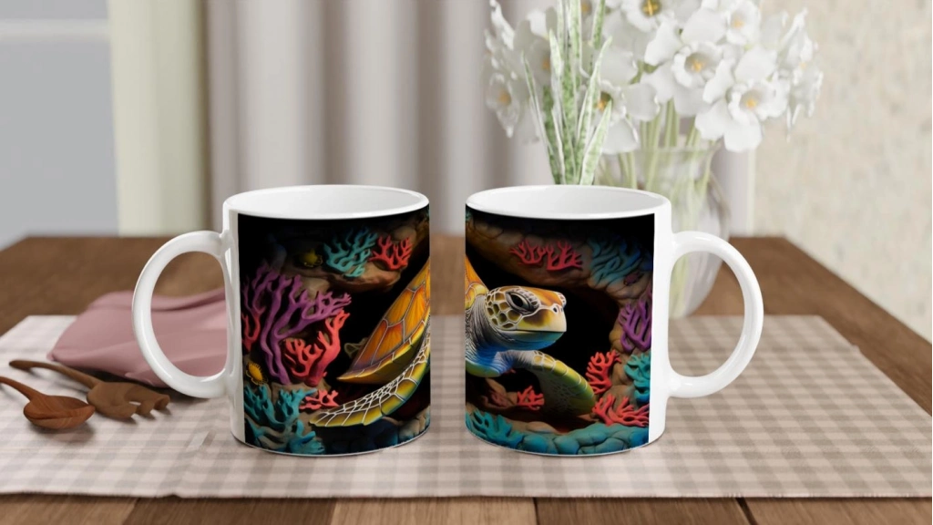 Su altı temalı kupa bardaklarımızda kullanılan süblimasyon baskı, canlı renk geçişleri ve yüksek detay seviyesiyle okyanus hissini görsel olarak yansıtır. Tüm baskılı ürünlerde olduğu gibi uzun ömürlü kullanım için elde yıkama önerilir.