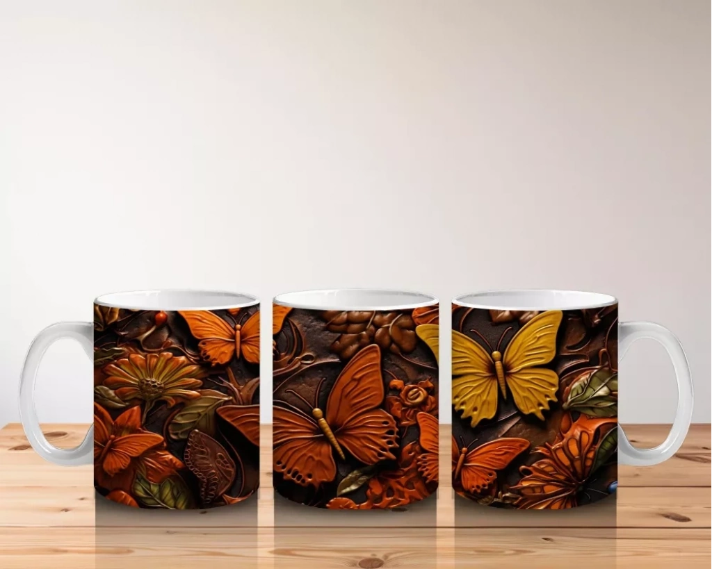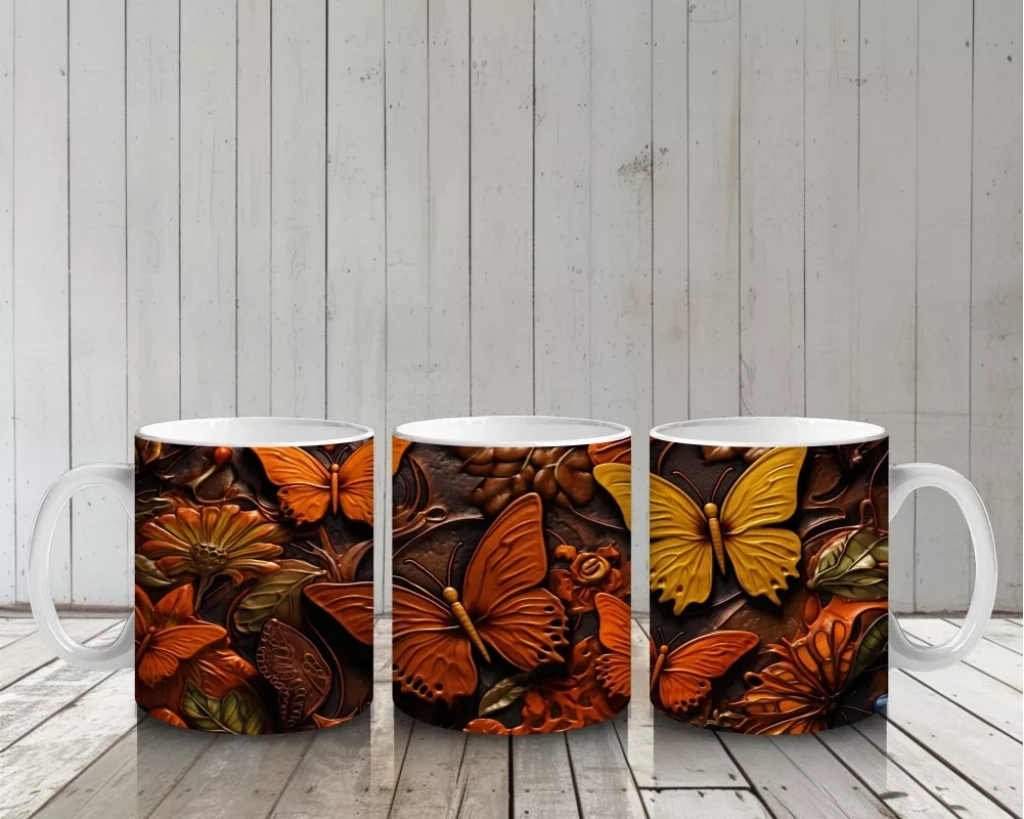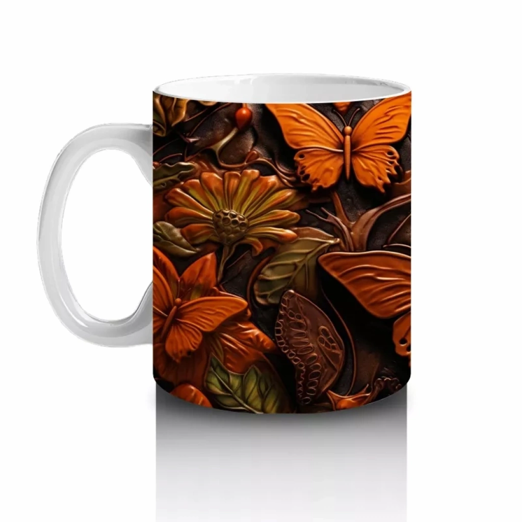 Turuncu kelebeklerin kolajından oluşan desen, canlılık ve enerjiyi yansıtıyor. Dinamik ve renkli tasarımlar arayanlar için özel bir kupa.