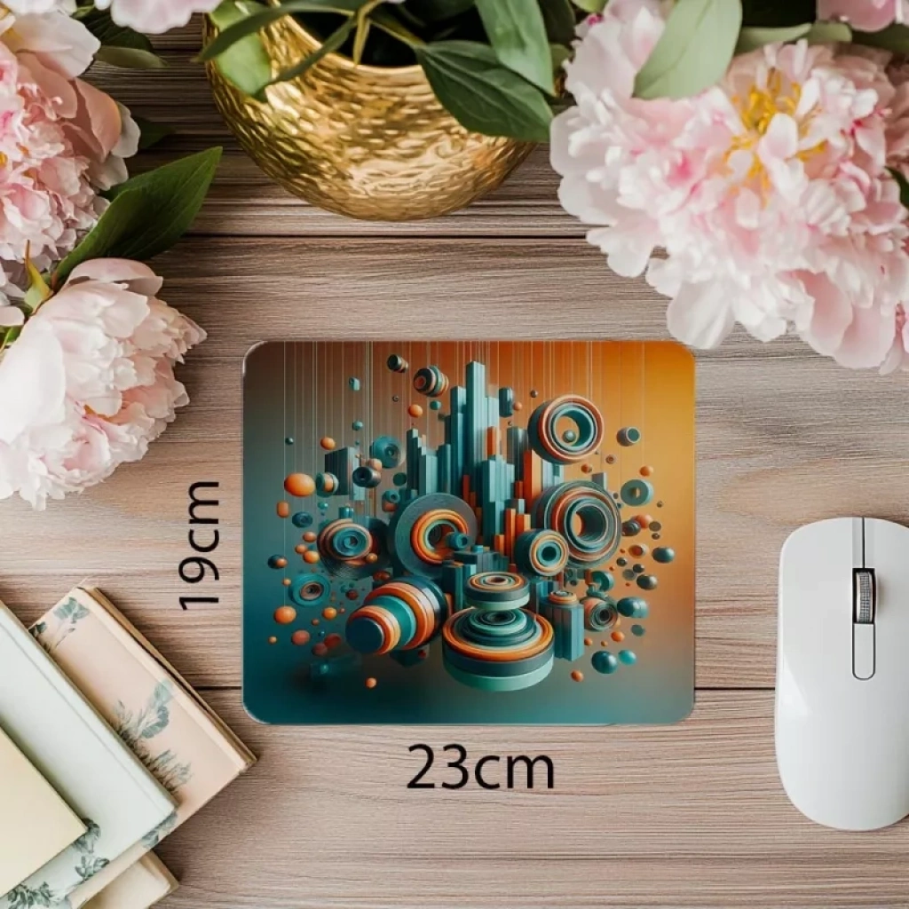Turuncu ve turkuaz renklerin geometrik desenlerle birleştiği bu mousepad, enerjik ve modern bir tarz sunar.