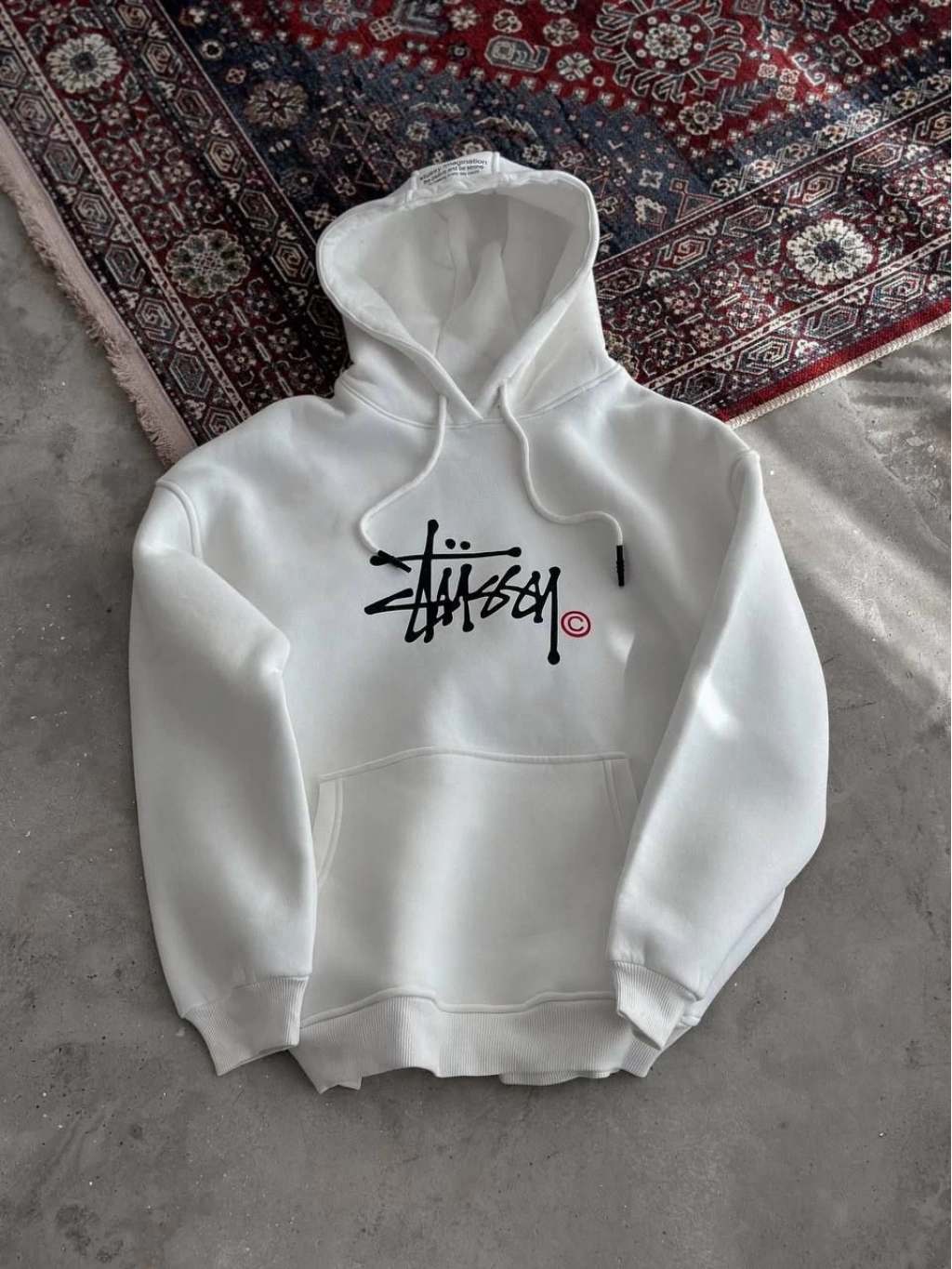 Üç İplik Kapşonlu Baskılı SweatShirt - Beyaz -