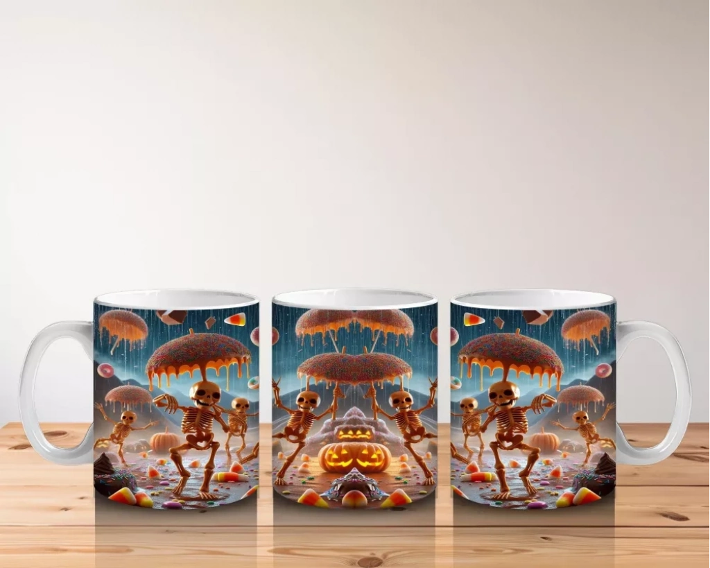 Uçan Balkabakları ve Şekerlerle Renkli Cadılar Bayramı Baskılı Kupa BardakUçan balkabakları ve şekerlerle tasarlanan bu renkli kupa bardak, Cadılar Bayramı’na neşeli ve canlı bir hava katar.