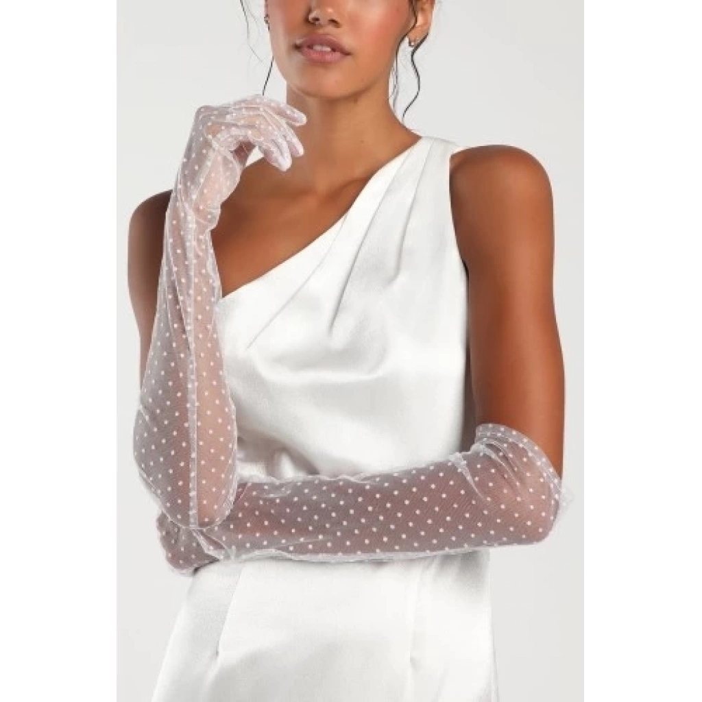 Uzun Boy Beyaz Puantiyeli Beyaz Renk Yetişkin Tül Eldiven