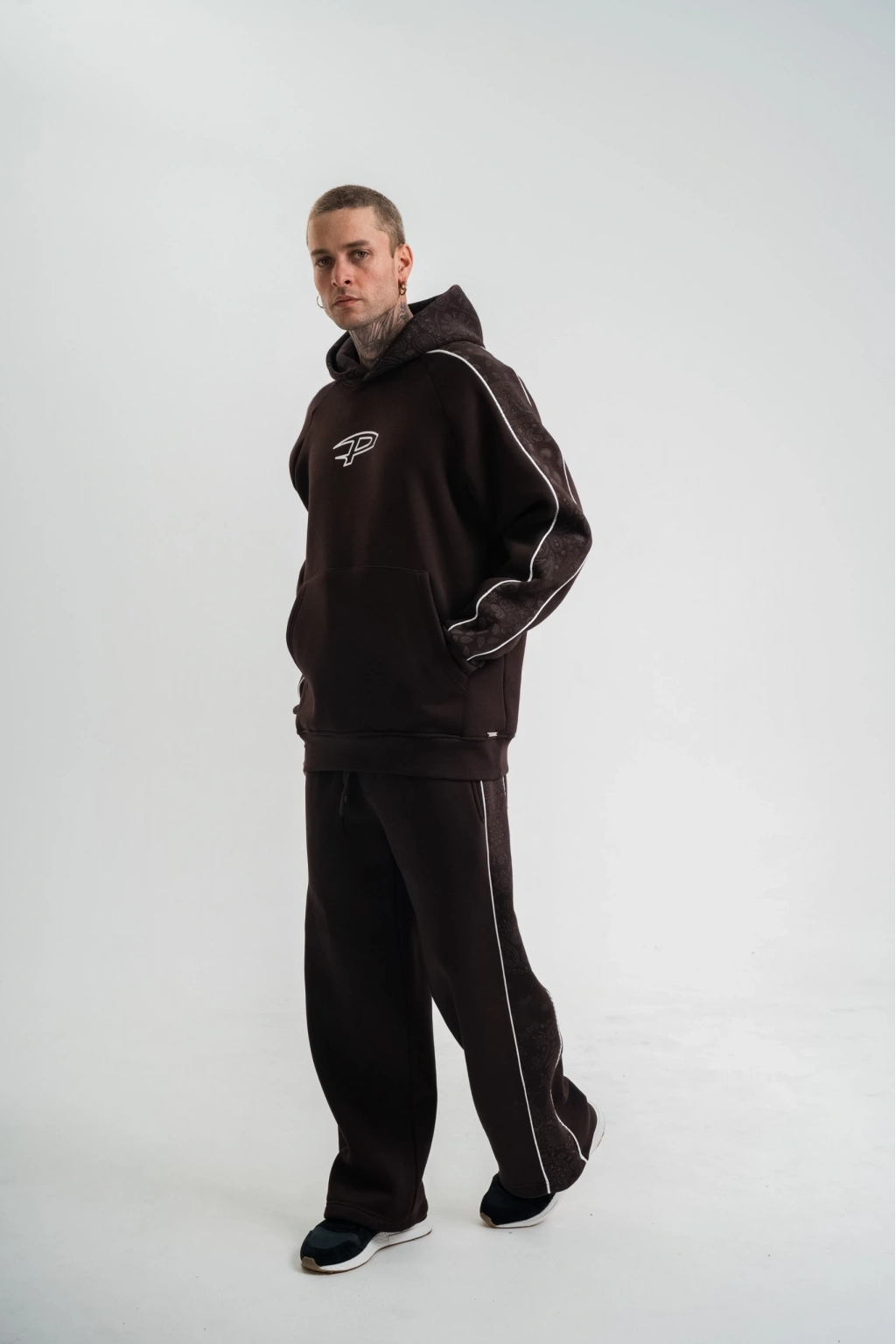 Uzun Kol Kapşonlu Ara Biyeli Baggy Eşofman Takım - Kahve