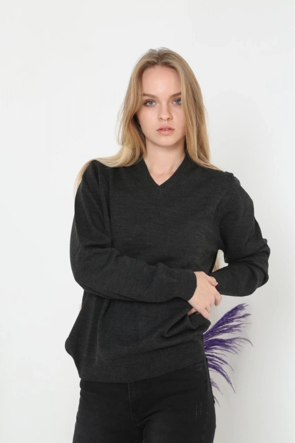 Uzun Kol V Yaka Triko Kazak - Füme