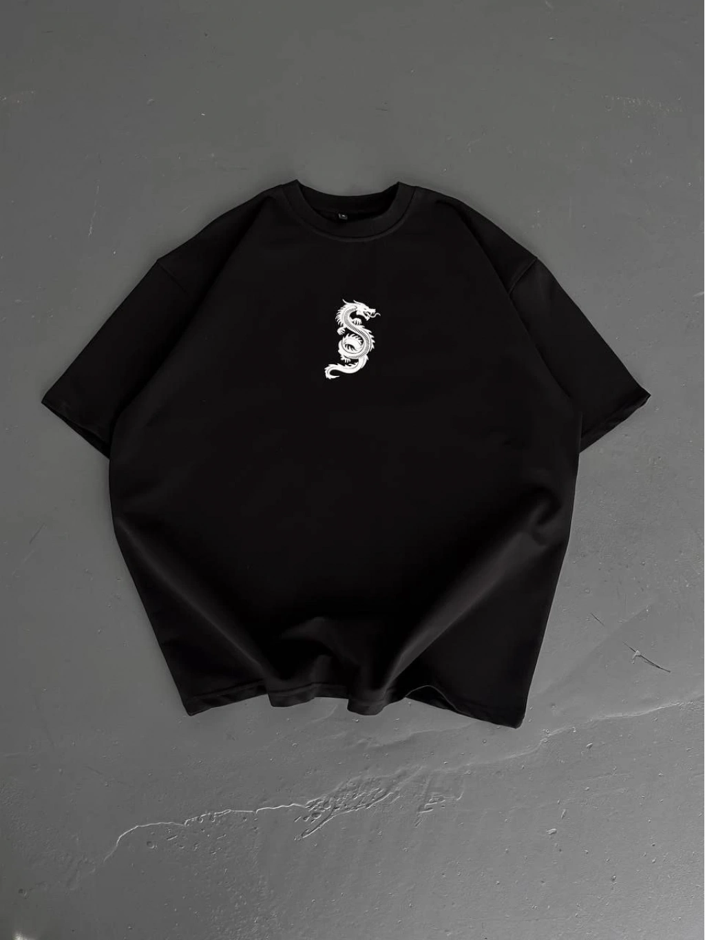 Baskılı Oversize Bisiklet Yaka T-shirt - Siyah -