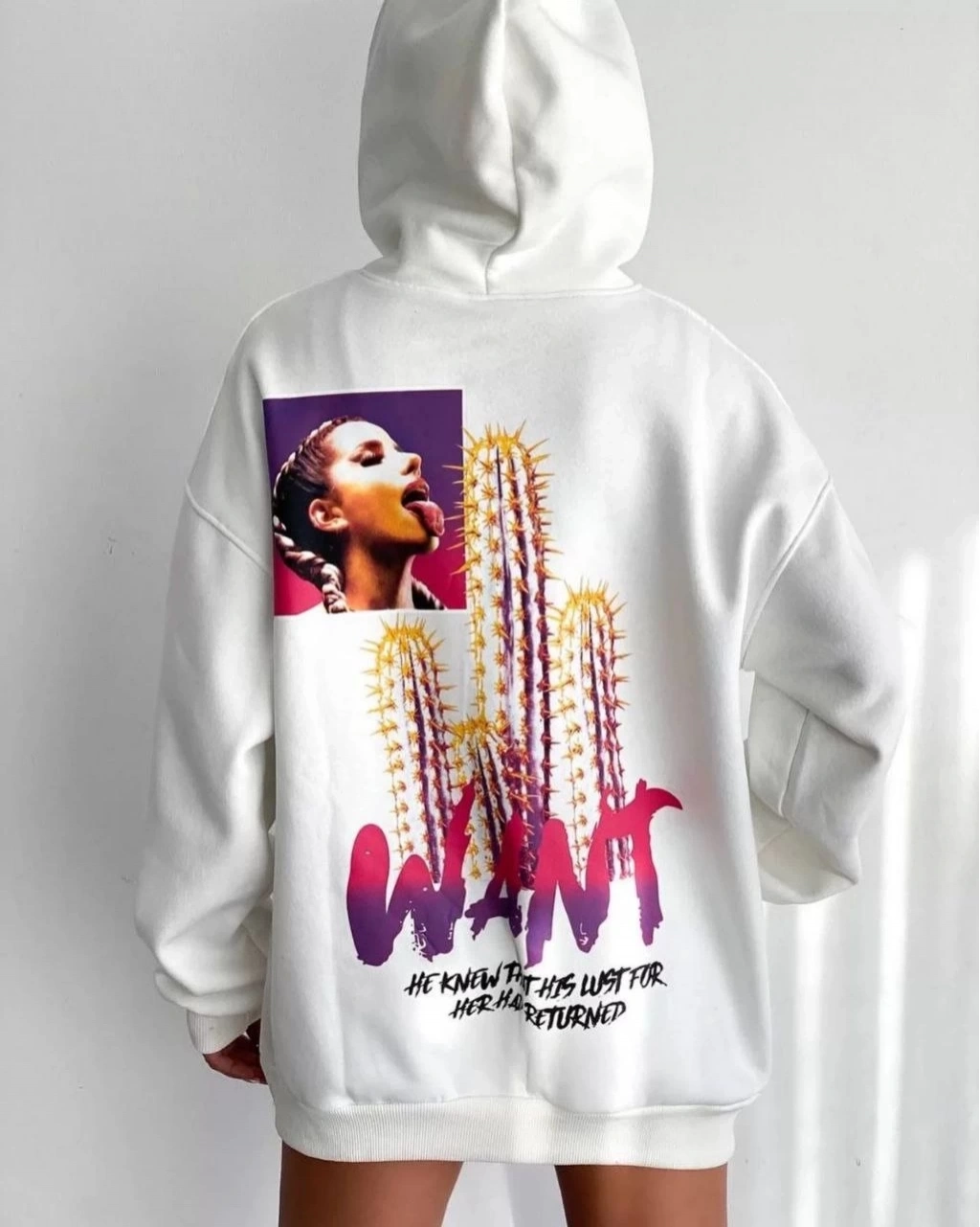 Baskılı Üç İplik Kapüşonlu Oversize Sweatshirt - Beyaz -