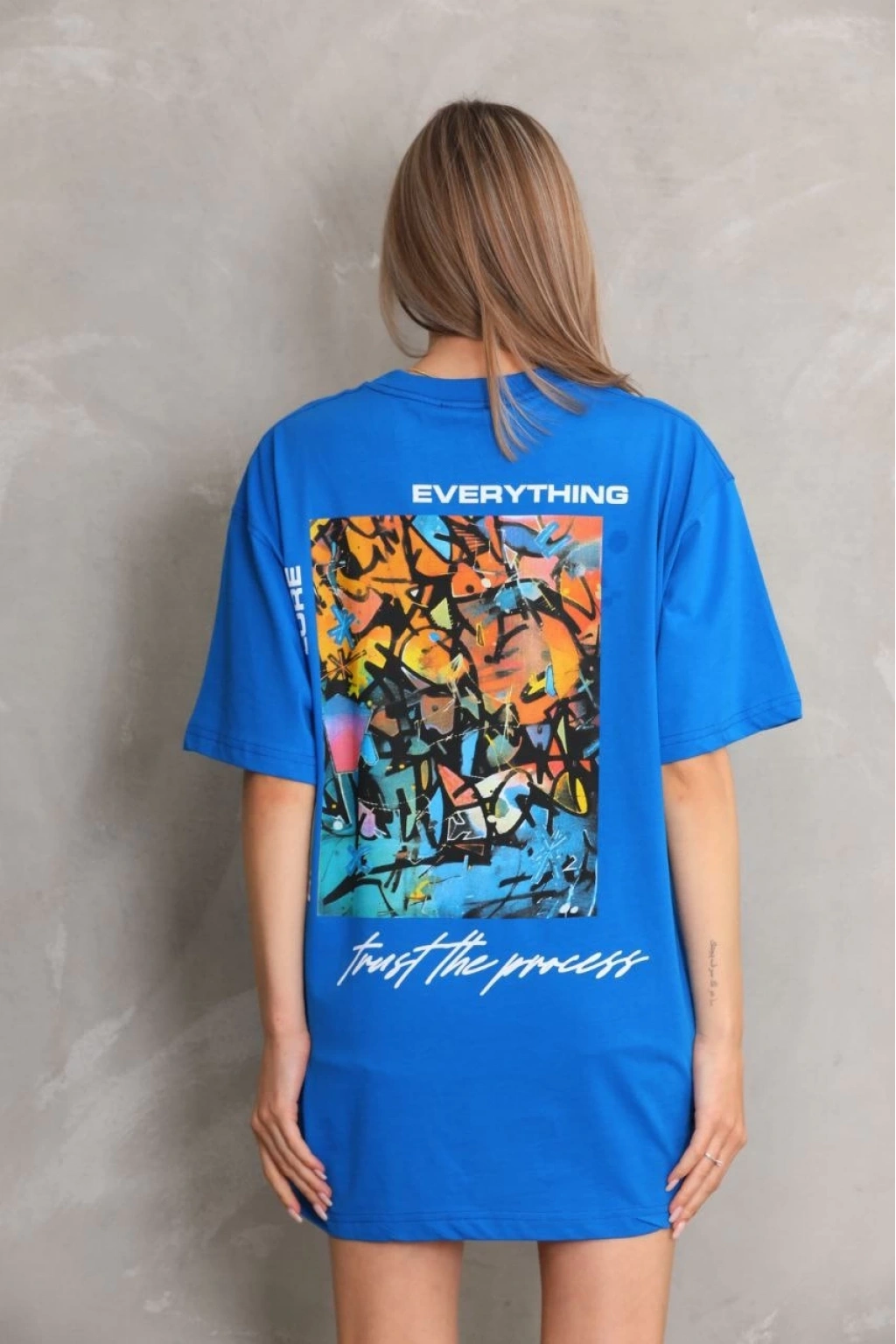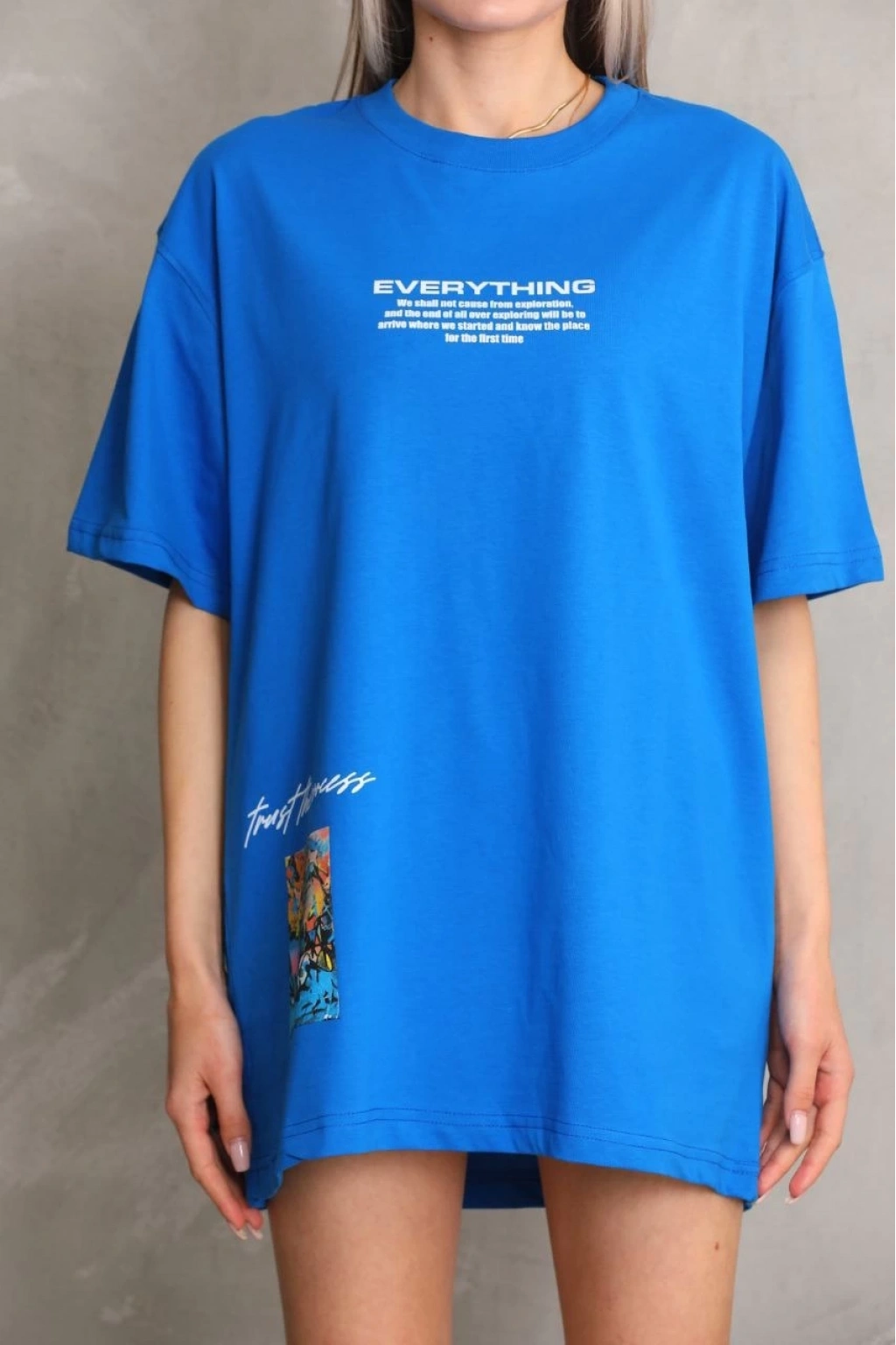 Bisiklet Yaka Baskılı Oversize T-Shirt - Mavi -