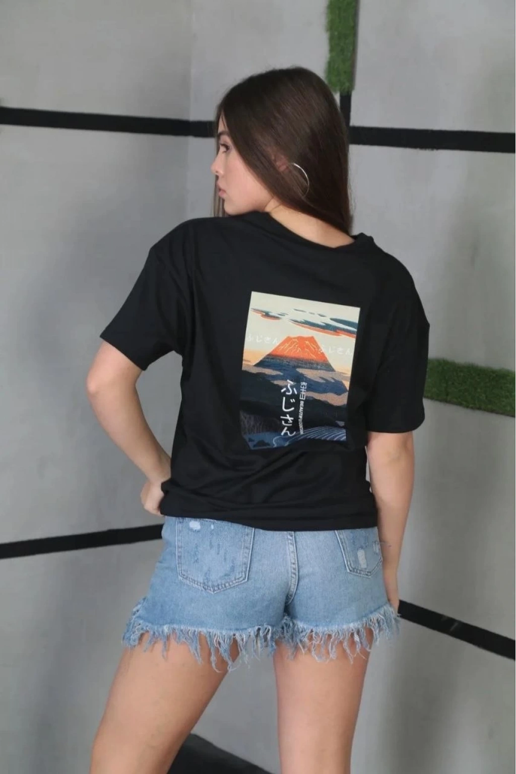 Bisiklet Yaka Baskılı Oversize T-Shirt - Siyah -