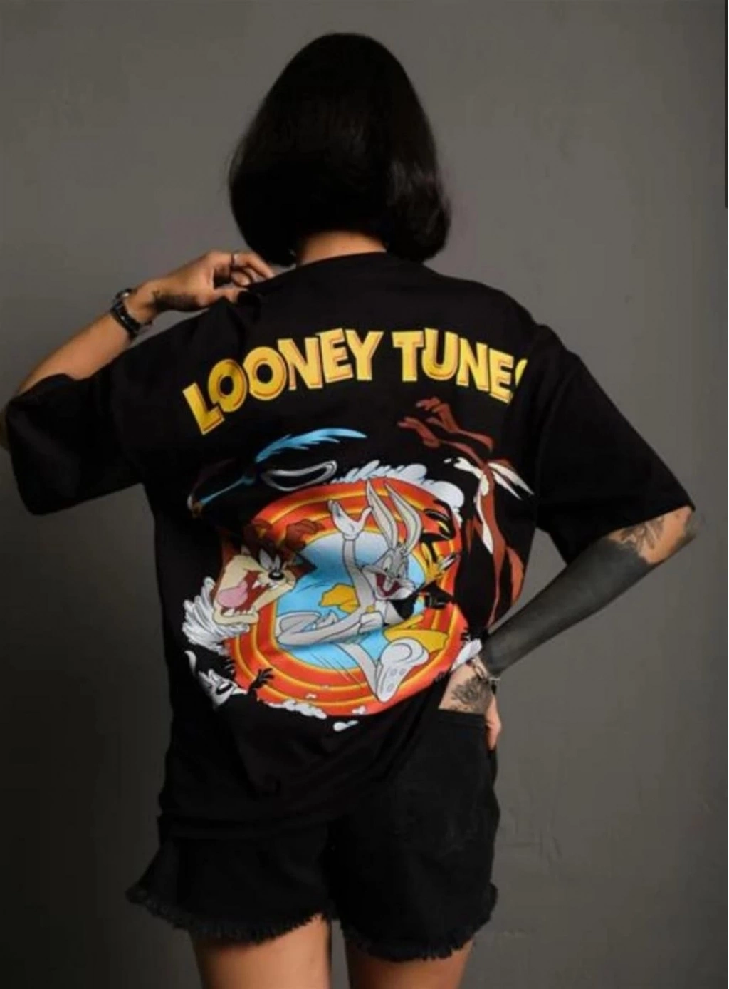 Bisiklet Yaka Baskılı Oversize T-Shirt - Siyah -