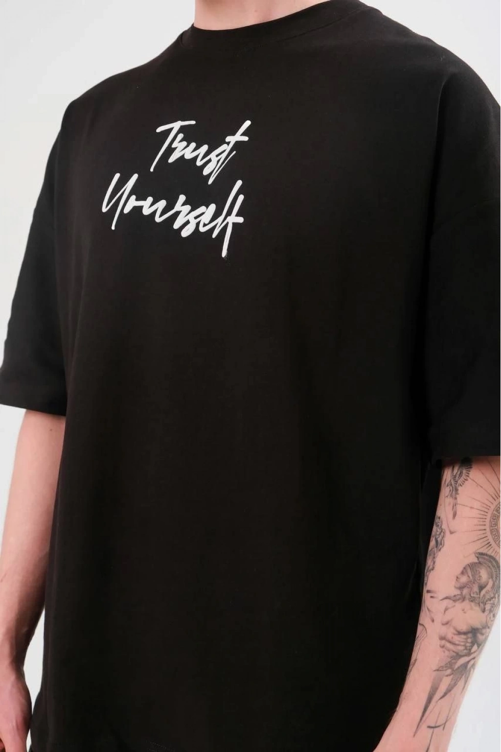 Bisiklet Yaka Baskılı Oversize T-Shirt - Siyah -