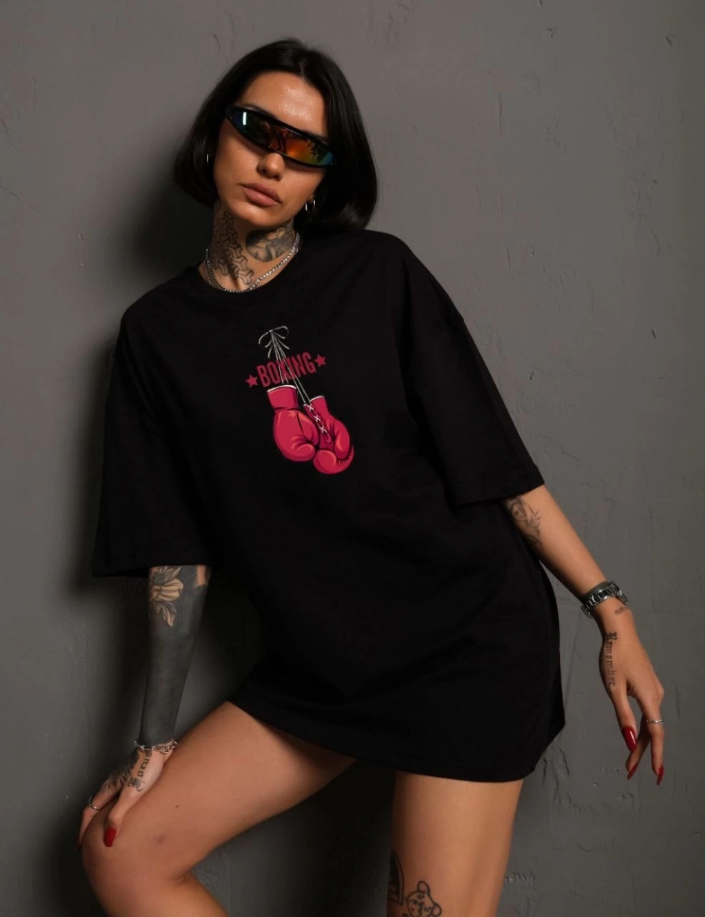 Bisiklet Yaka Baskılı Oversize T-Shirt - Siyah -