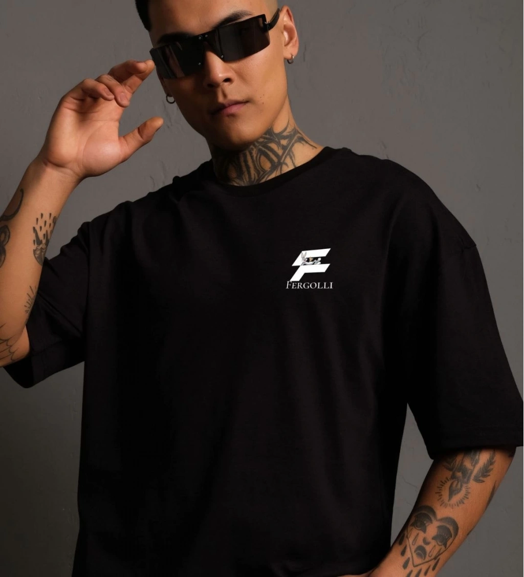 Bisiklet Yaka Baskılı Oversize T-Shirt - Siyah -