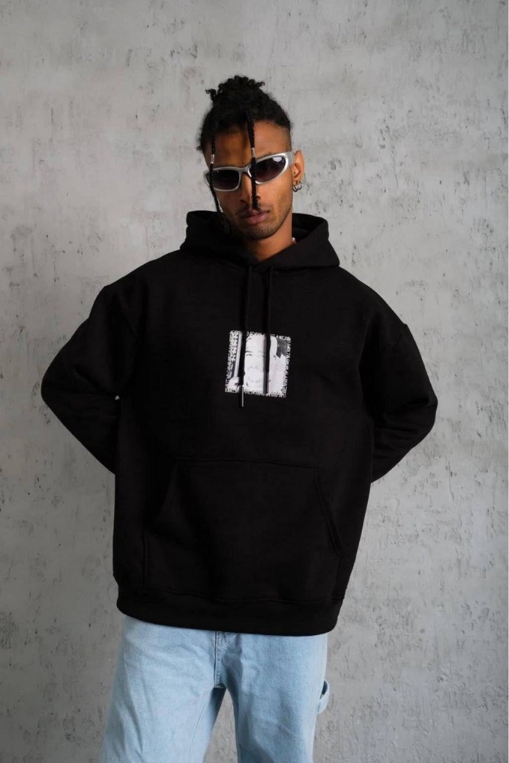 Ön Arka Baskılı Kapşonlu Sweat - Siyah -