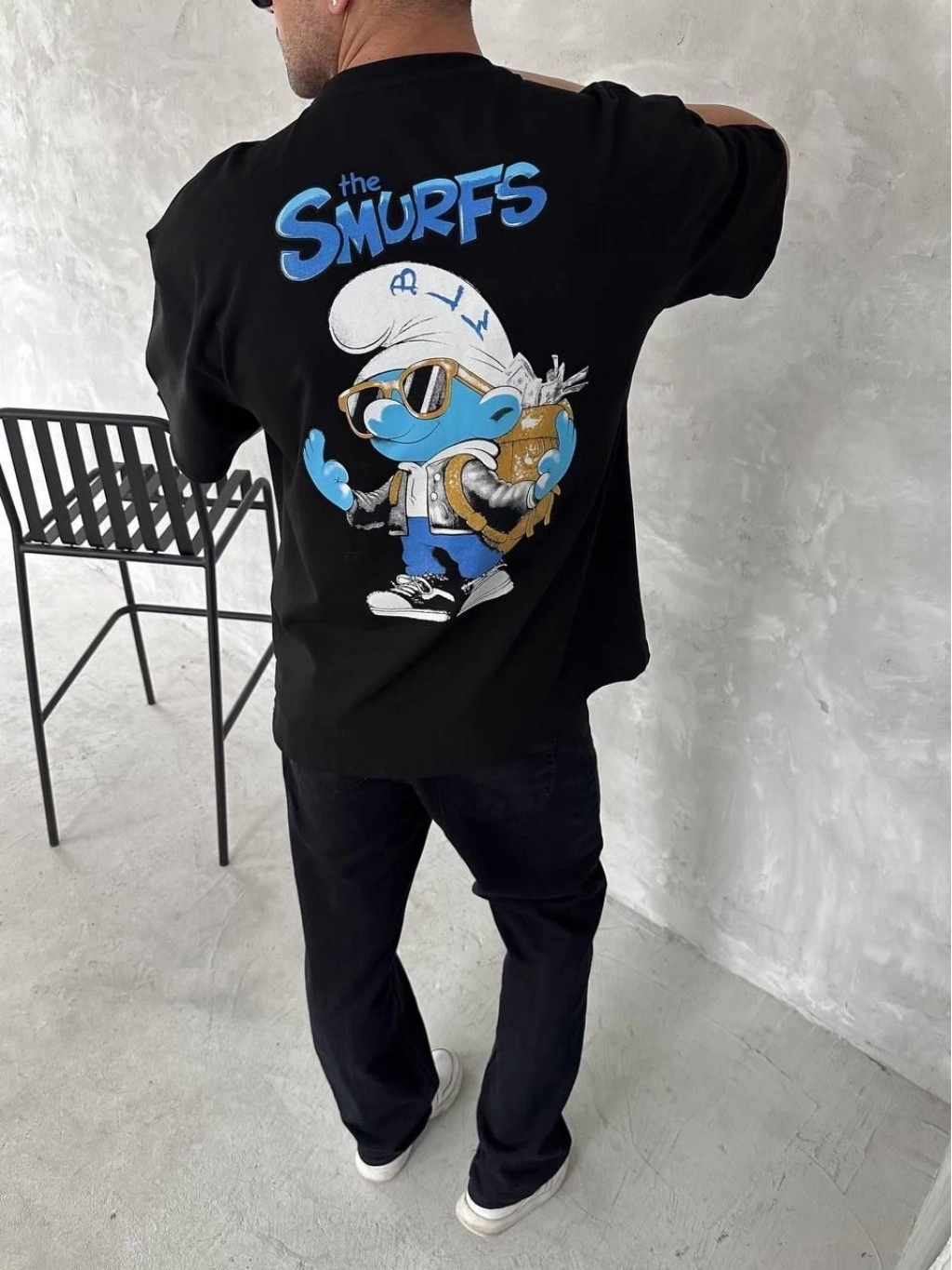 Ön ve Arka Baskılı Oversize Bisiklet Yaka T-shirt- Siyah -