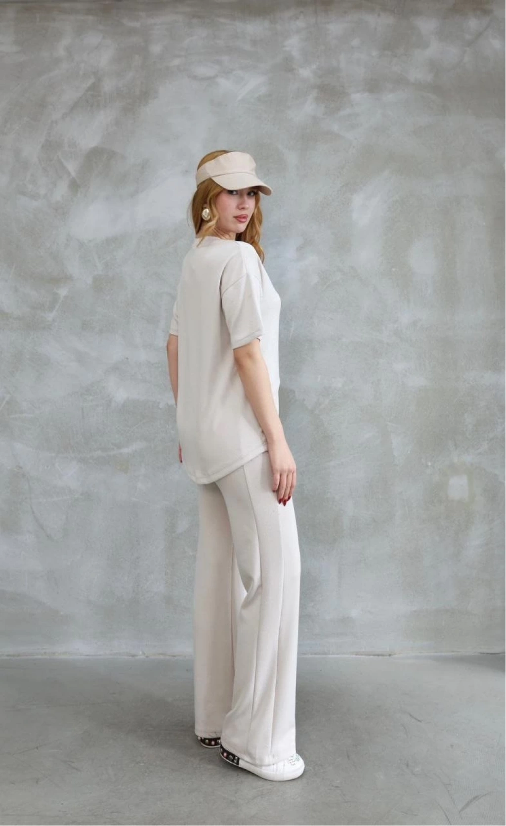 Osy Modal Yumuşak dokulu Kumaş Bisiklet Yaka Taş detaylı Kısa Kollu Takım - Kırık Beyaz -