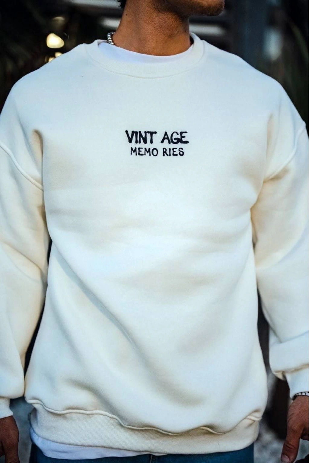Oversize Bisiklet Yaka Üç İplik Baskılı SweatShirt - Beyaz -