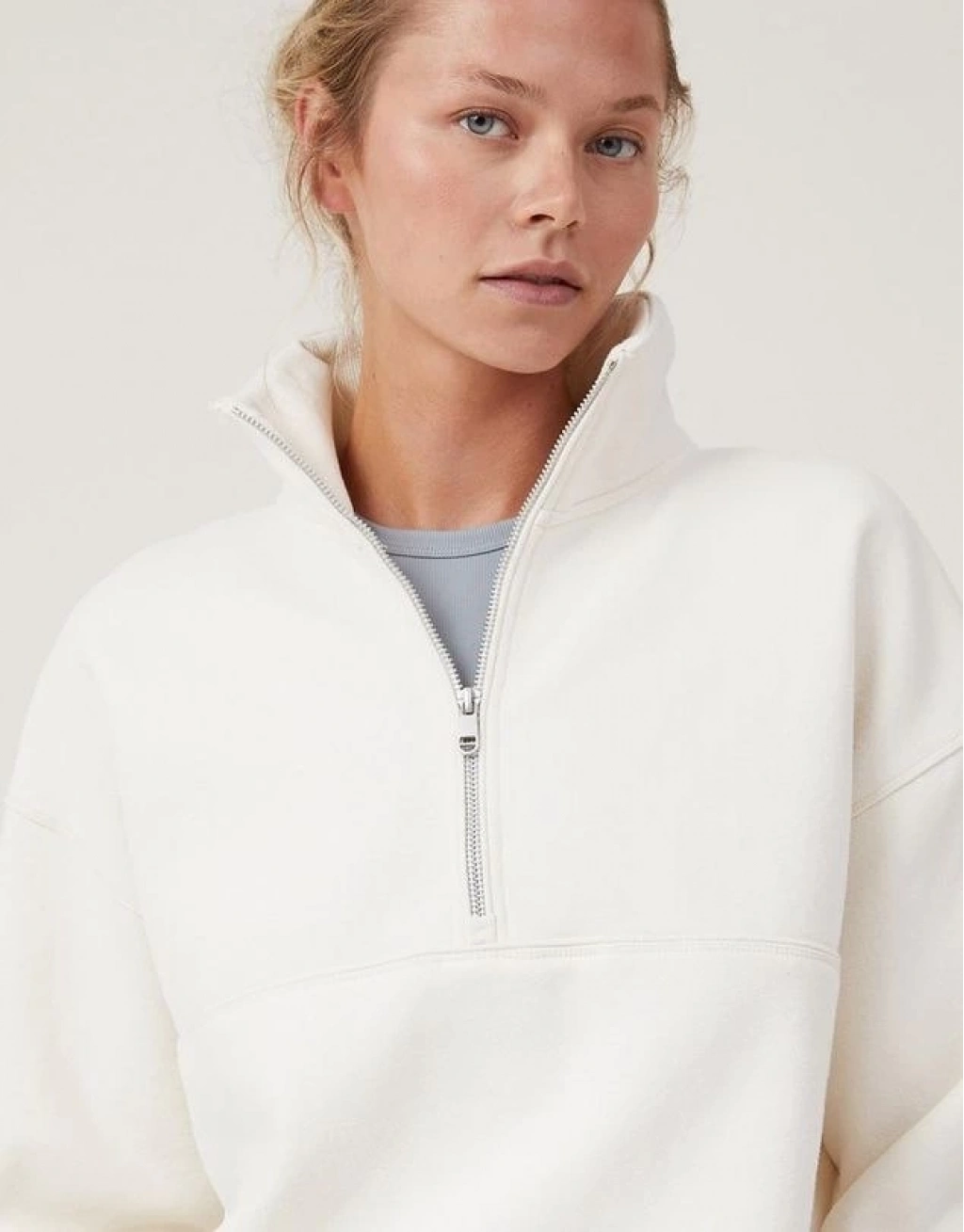 Oversize Yarım Farmuarlı Yakalı Basic SweatShirt - Beyaz -