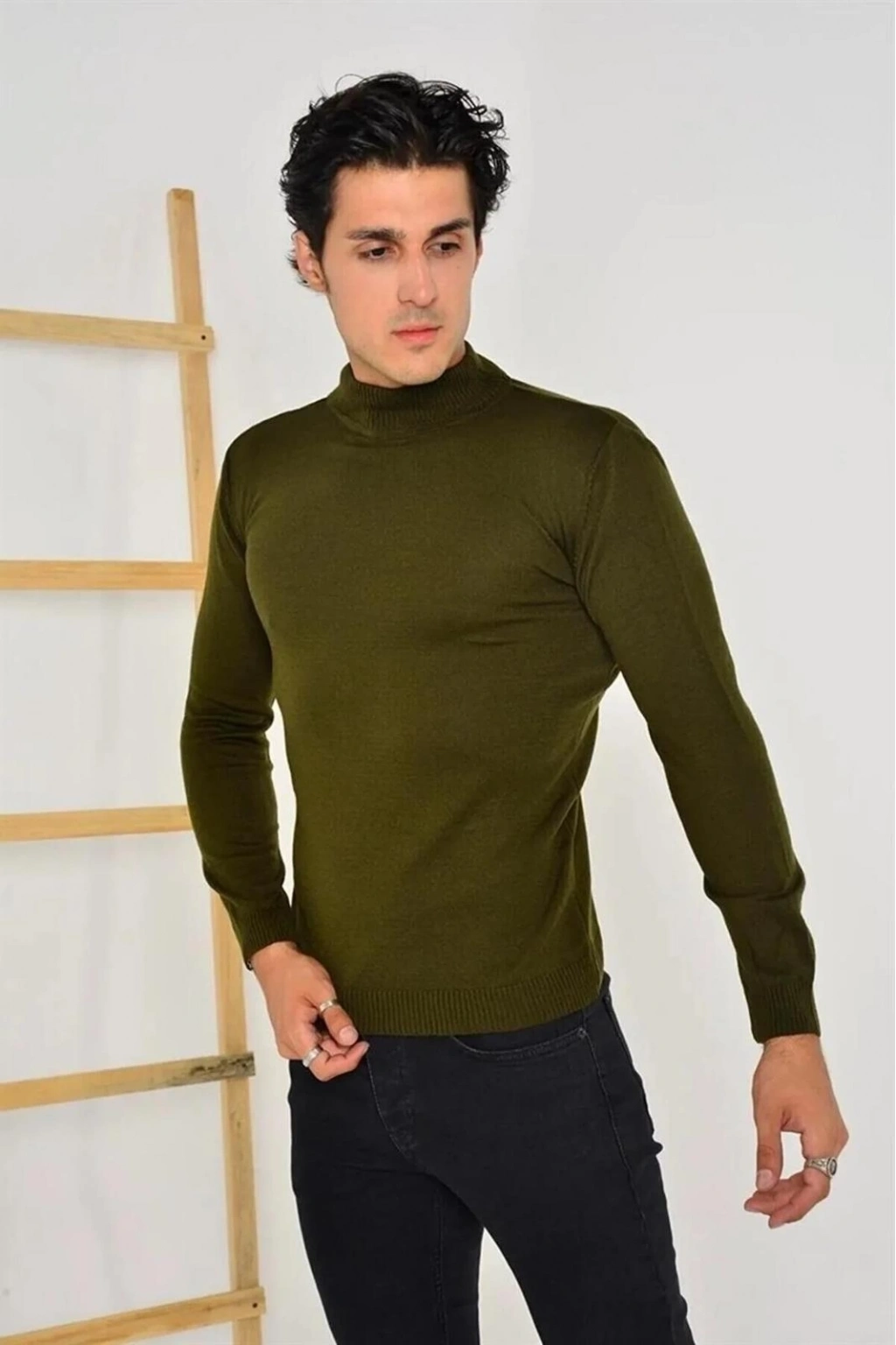 Tam Balıkçı Yaka Düz Renk Kazak - Yeşil -