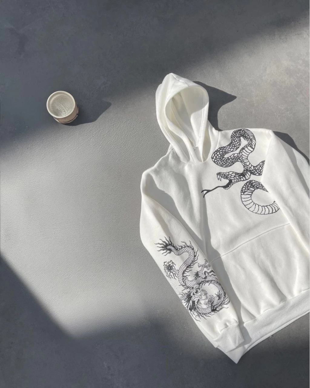 Uzun Kol Kapüşonlu Baskılı SweatShirt - Beyaz -