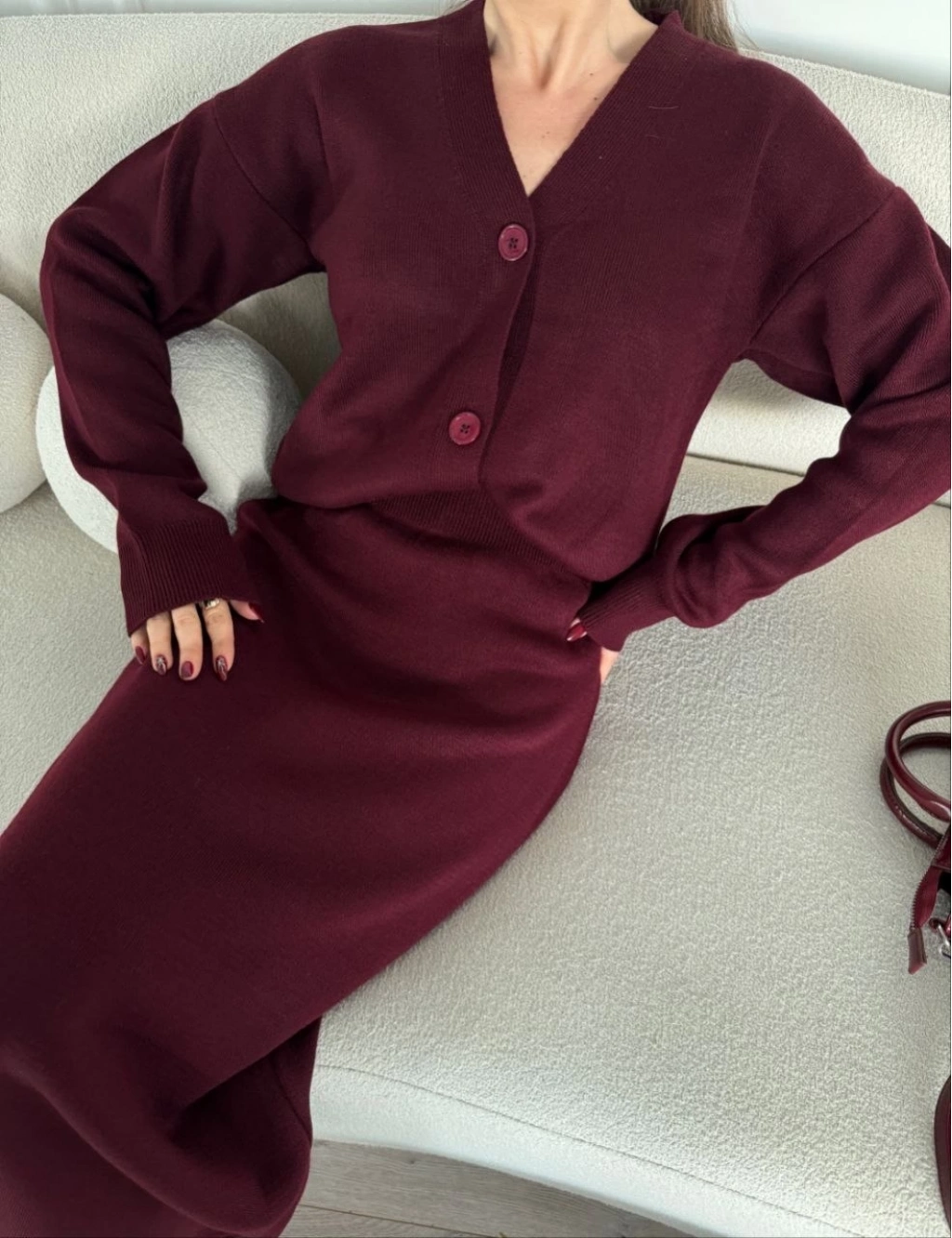 V Yaka 3 Düğmeli Hırka Takım Triko İkili Etekli - Bordo -