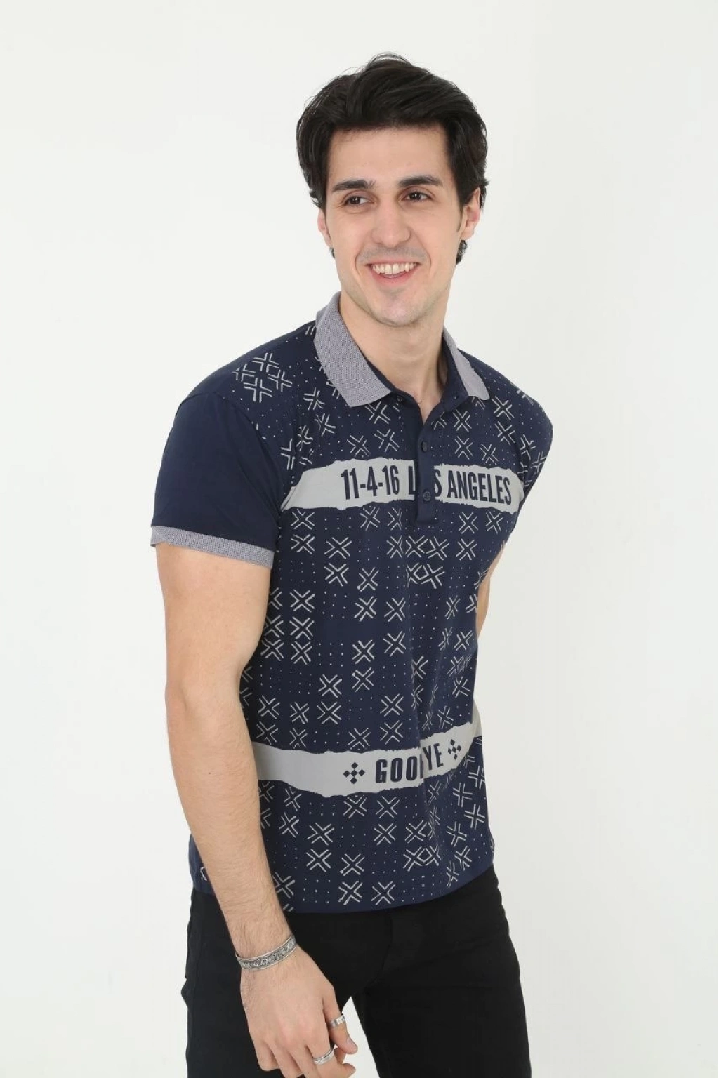 Yakalı Slim Fit Baskılı T-Shirt - Lacivert -