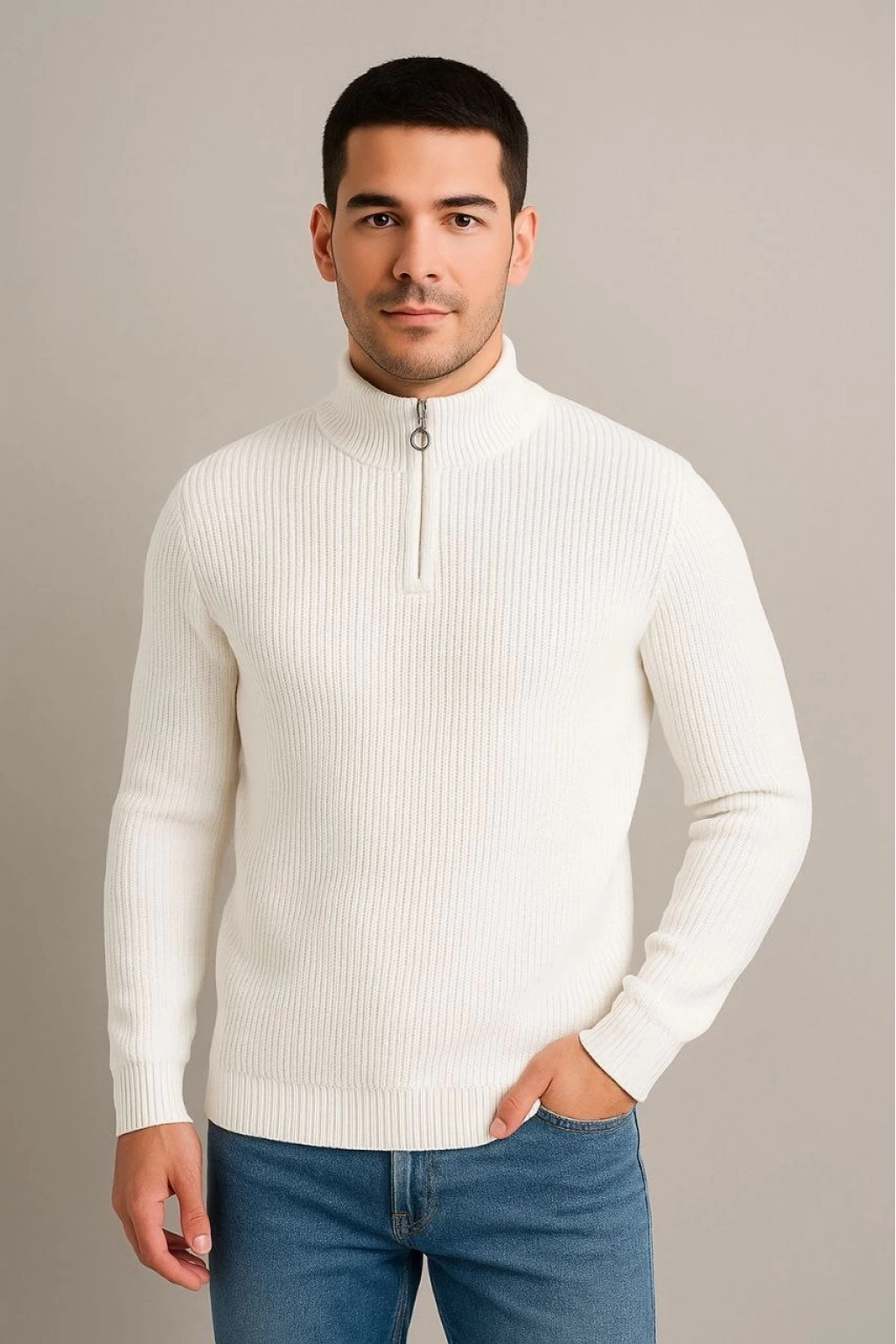 Yarım Fermuarlı Triko Kazak Beyaz -