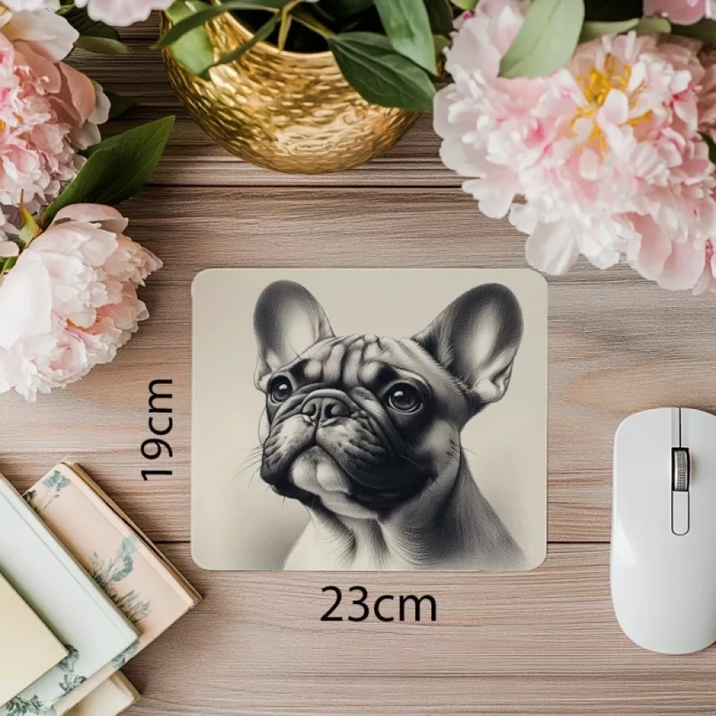 Vintage dokulu Fransız bulldog tasarımlı mouse pad, pürüzsüz kaydırma yüzeyi ve kaymaz taban ile uzun ömürlü ve çekici bir kullanım sunar.