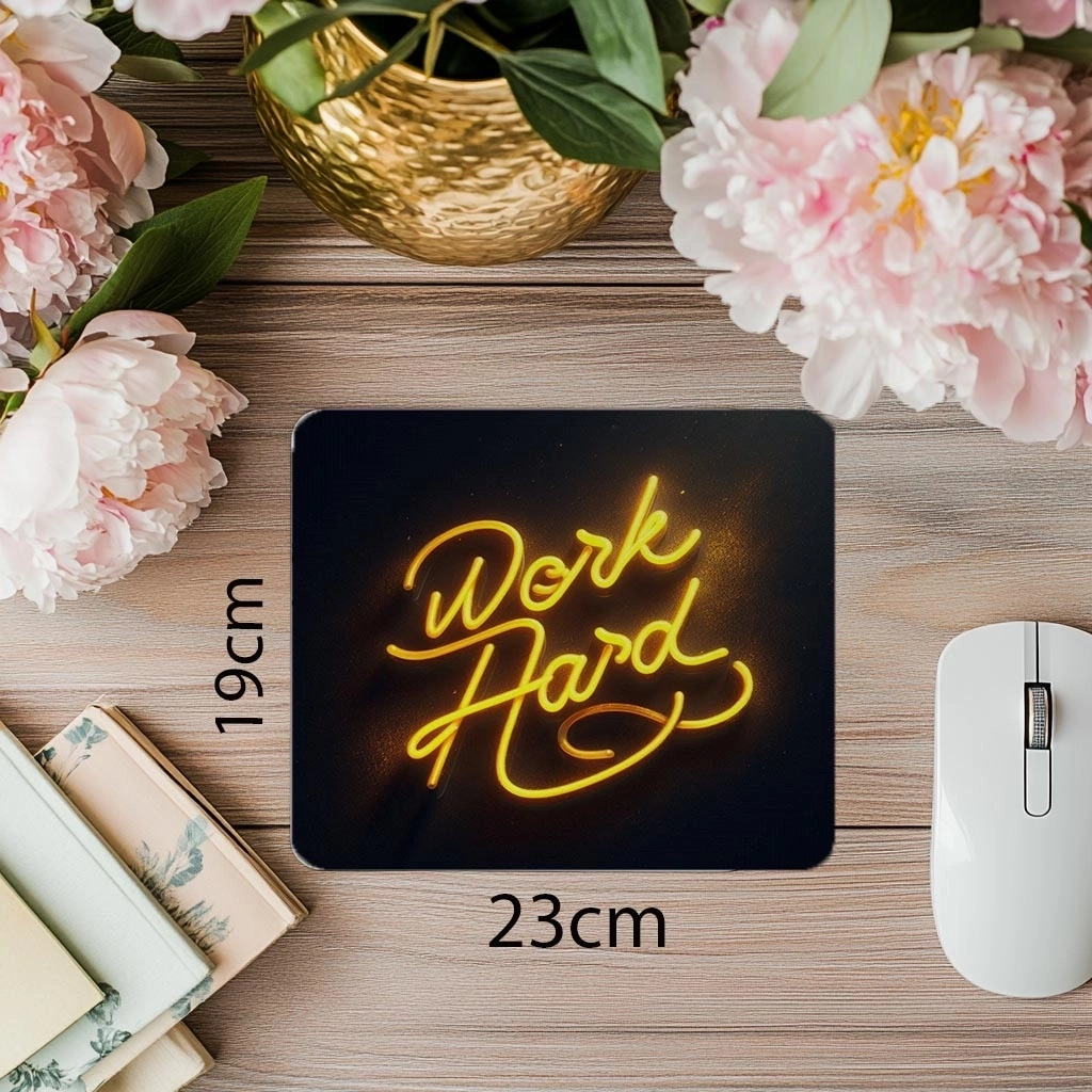 Work Hard yazılı koyu zeminli neon mousepad, pürüzsüz kaydırma yüzeyi ve kaymaz tabanıyla motive edici ışık efektleri eşliğinde konforlu bir çalışma deneyimi sunar.