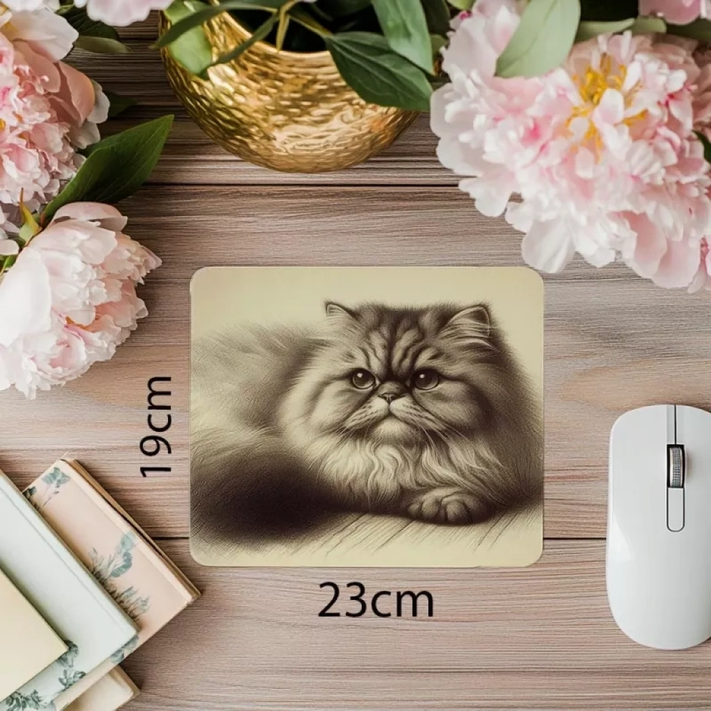 Yana yatmış İran kedisi tüylü detaylı mousepad, pürüzsüz kaydırma yüzeyi ve kaymaz alt tabanıyla şık ve konforlu deneyim sağlar.