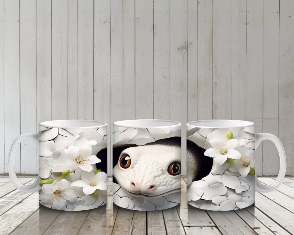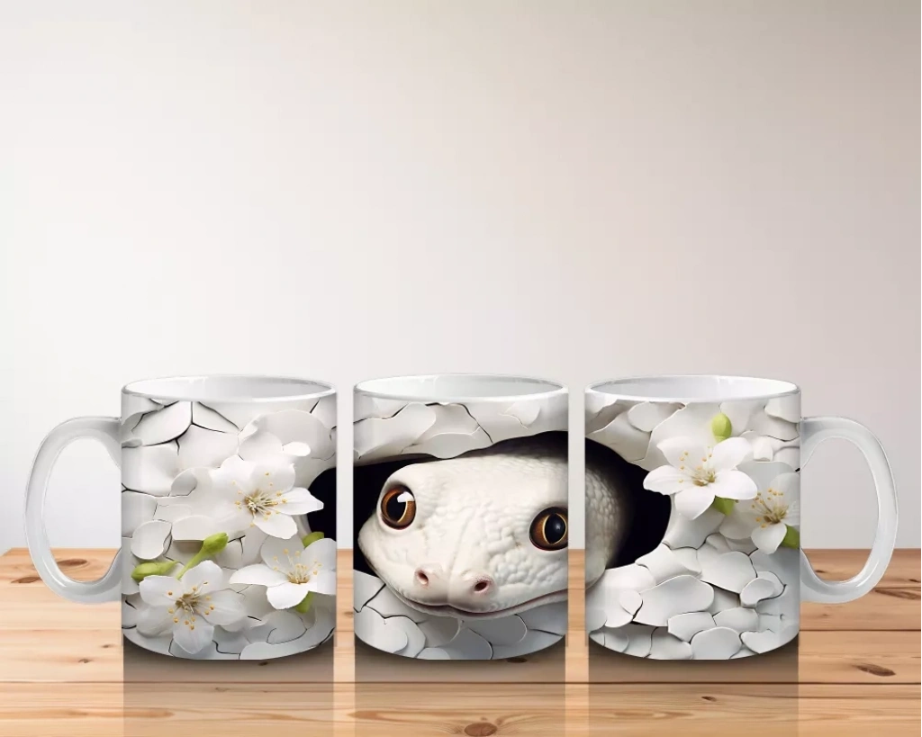 Yapraklar arasından dikkatle bakan bu meraklı yılan, doğanın gizemli yüzünü yansıtıyor. Farklı ve sıra dışı hayvan figürlerini sevenler için cesur bir kupa tasarımı.