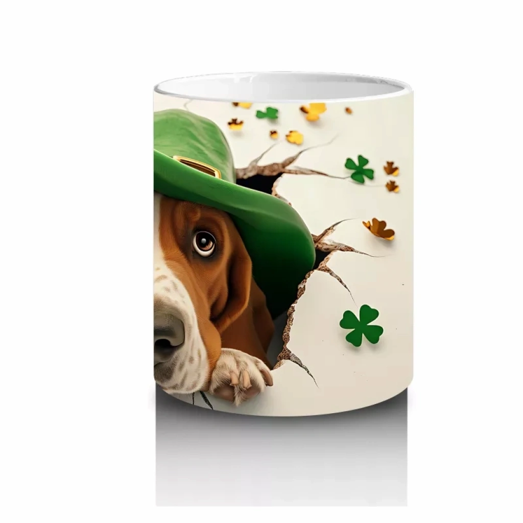 Yeşil Şapkalı Basset Hound Figürü ve Yonca Detayları – Baskılı Kahve Kupası