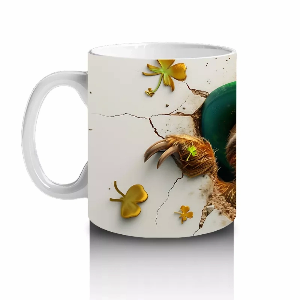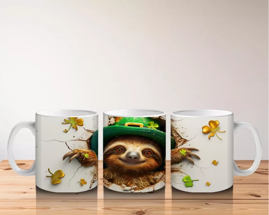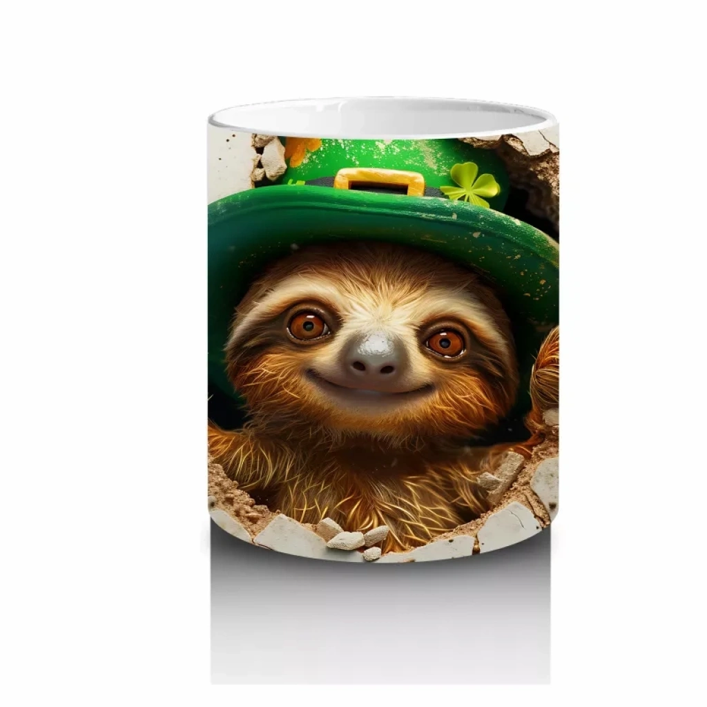 Yonca Yapraklarıyla Süslenmiş Gülümseyen Tembel Hayvan – Baskılı Kahve Kupası